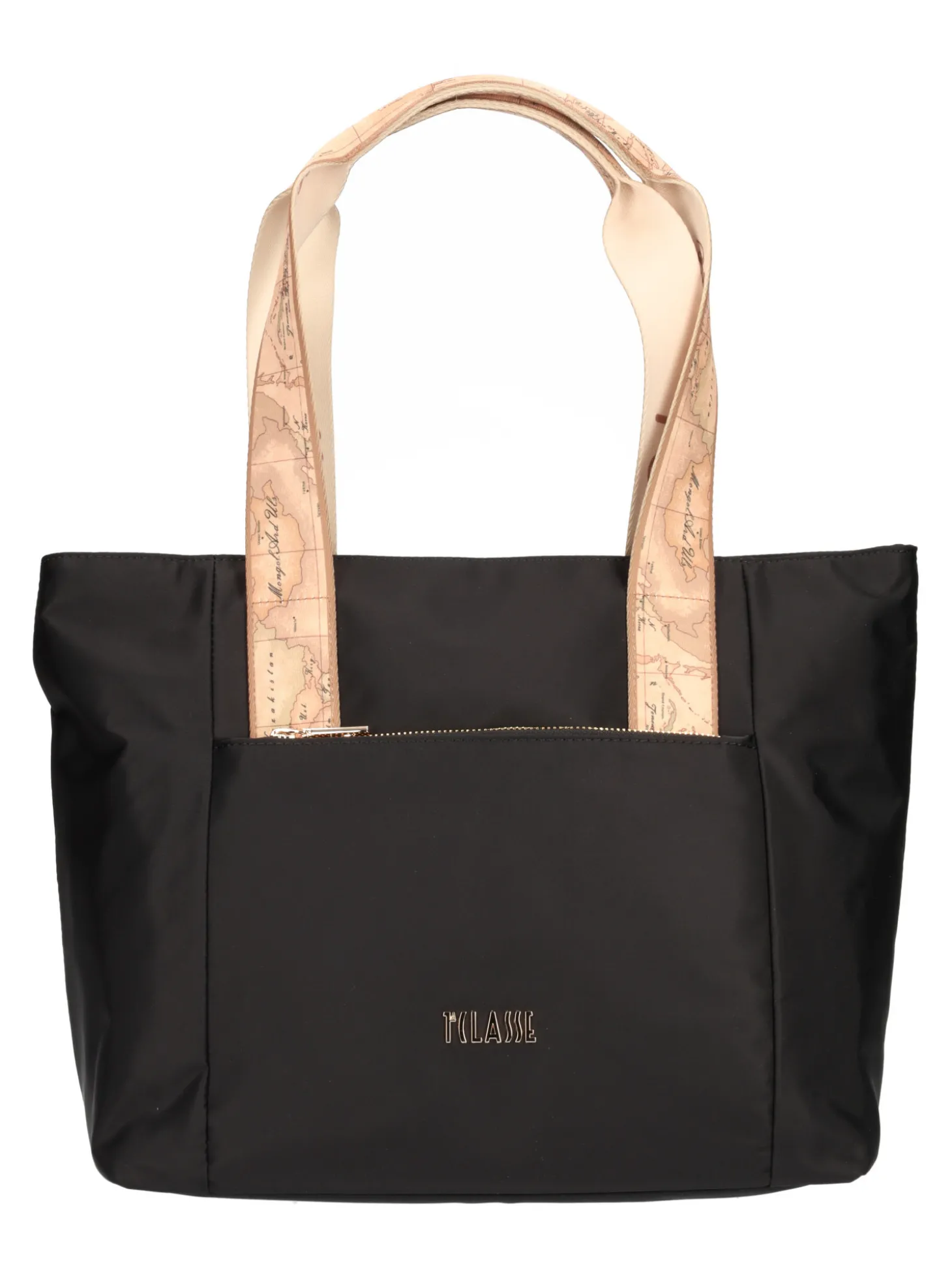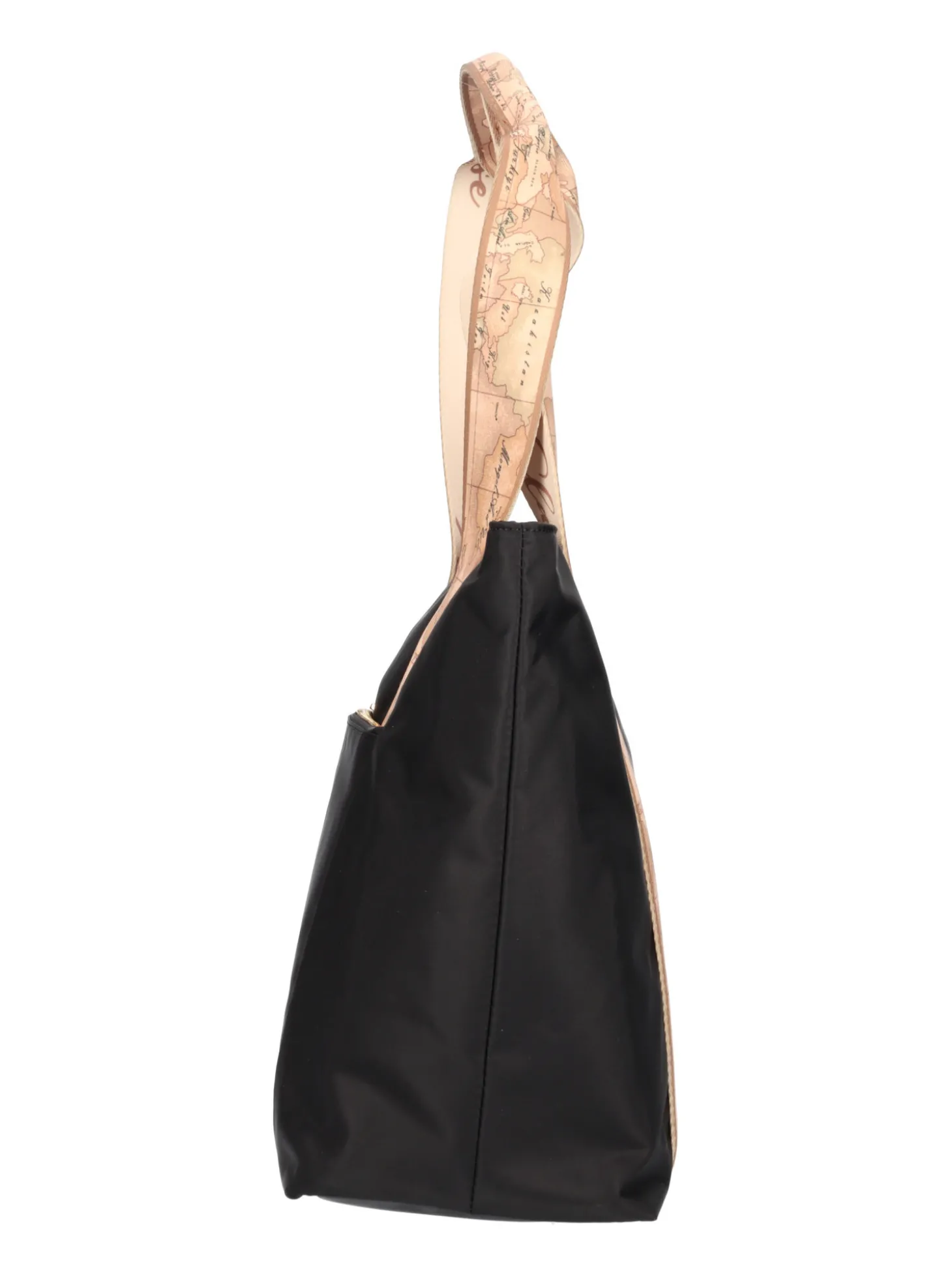 Shopping bag Alviero Martini 1a Classe da donna in nylon riciclato nero con dettagli in tessuto geografico e doppio manico. Borsa con zip centrale, taschini interni ed uno esterno.
