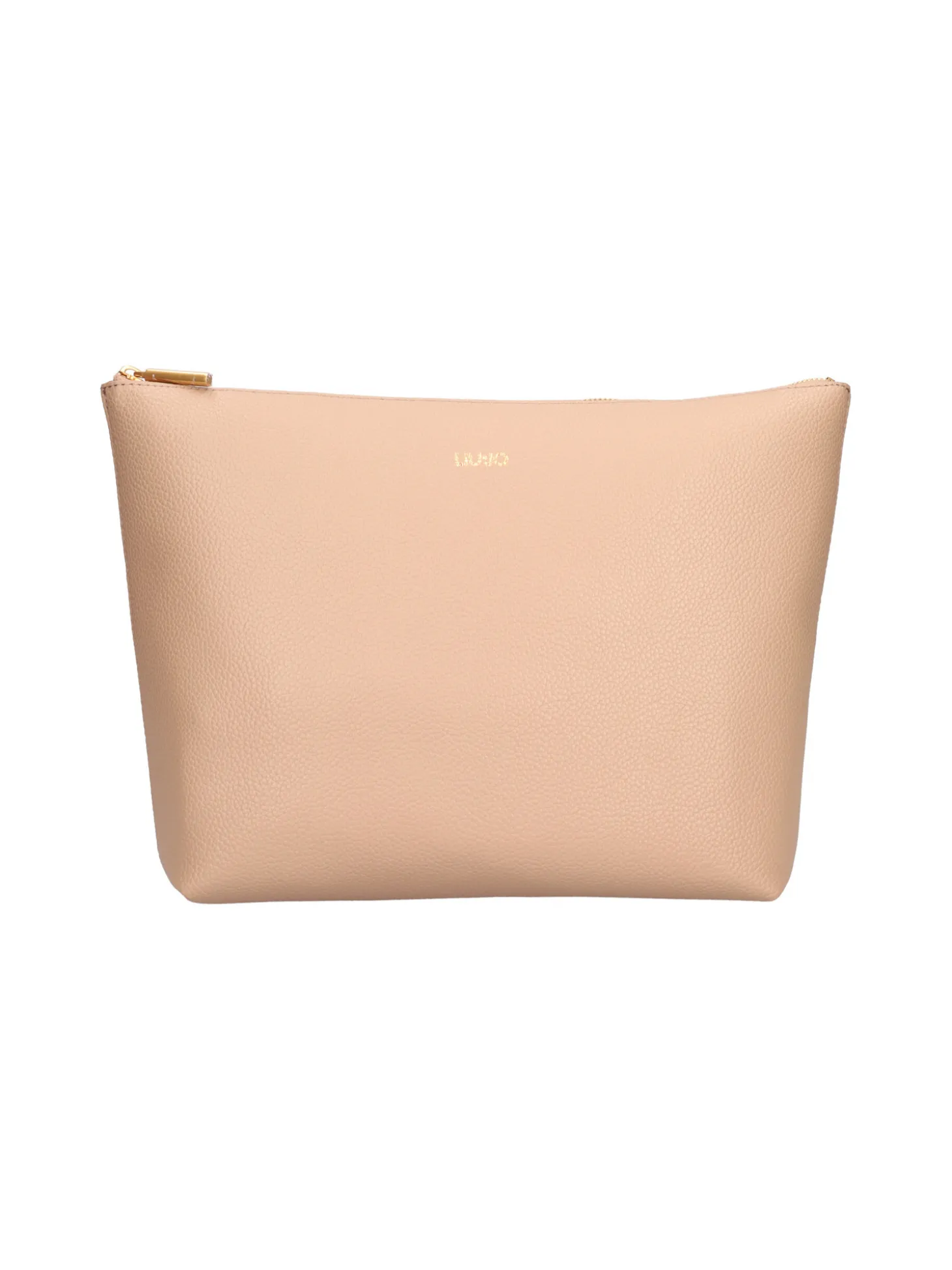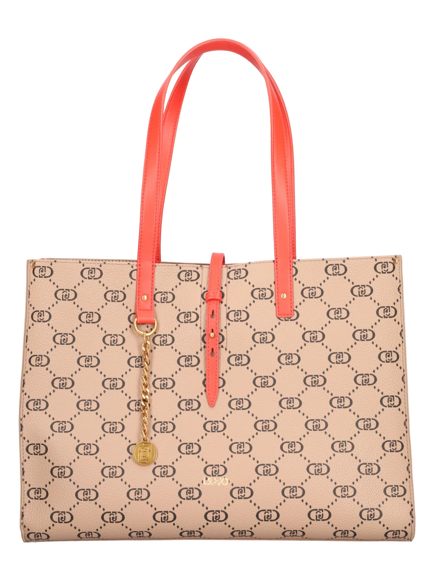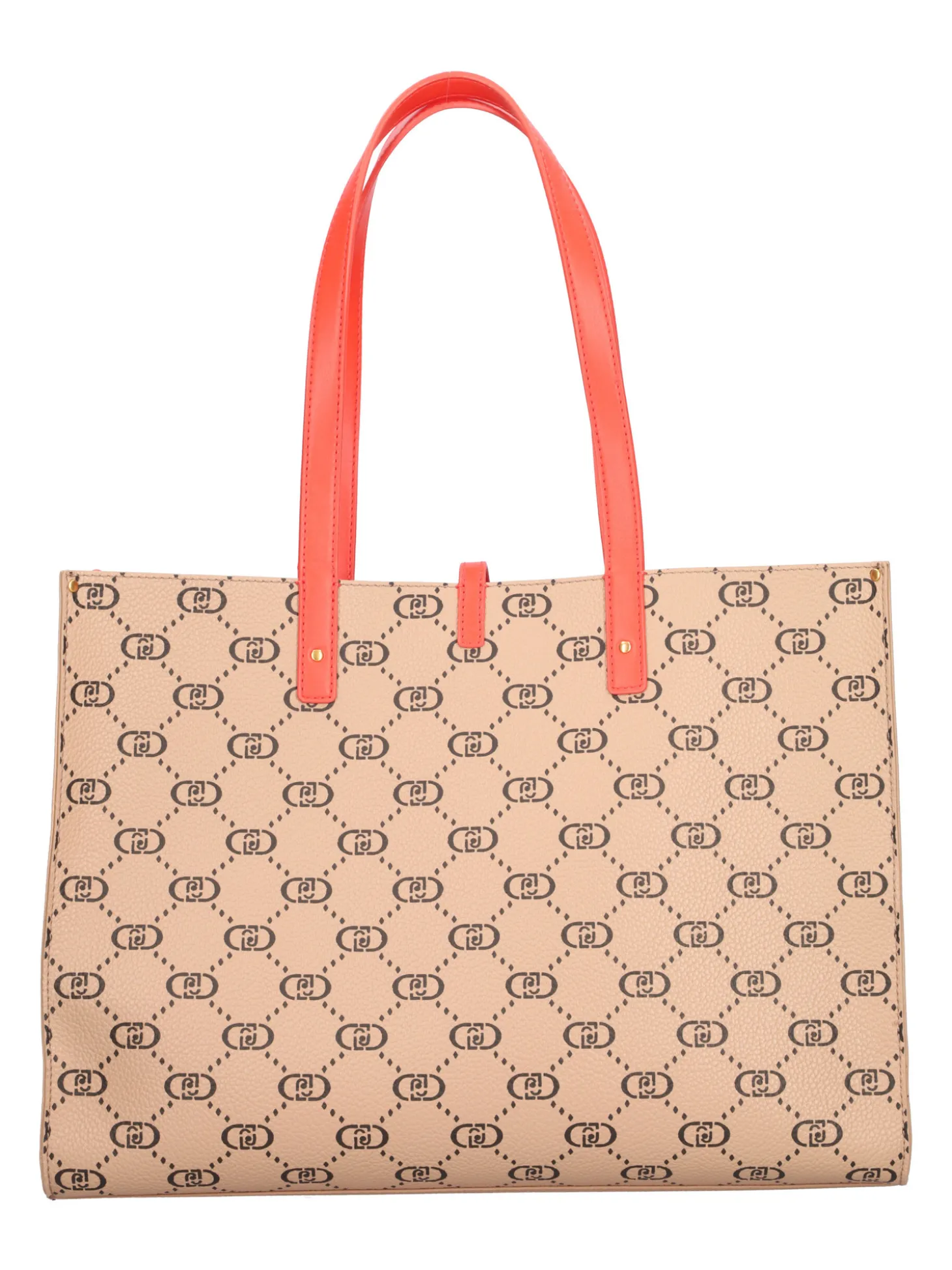 Shopping bag Liu Jo da donna in morbida ecopelle beige logata con doppio manico lungo e tracolla regolabile arancione. Borsa aperta, chisura con fibbia e all’interno un borsello removibile.