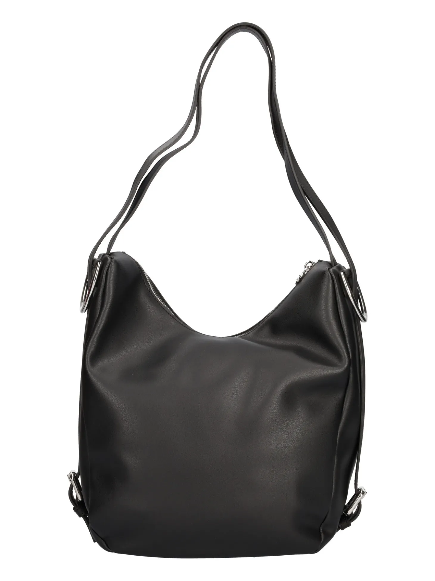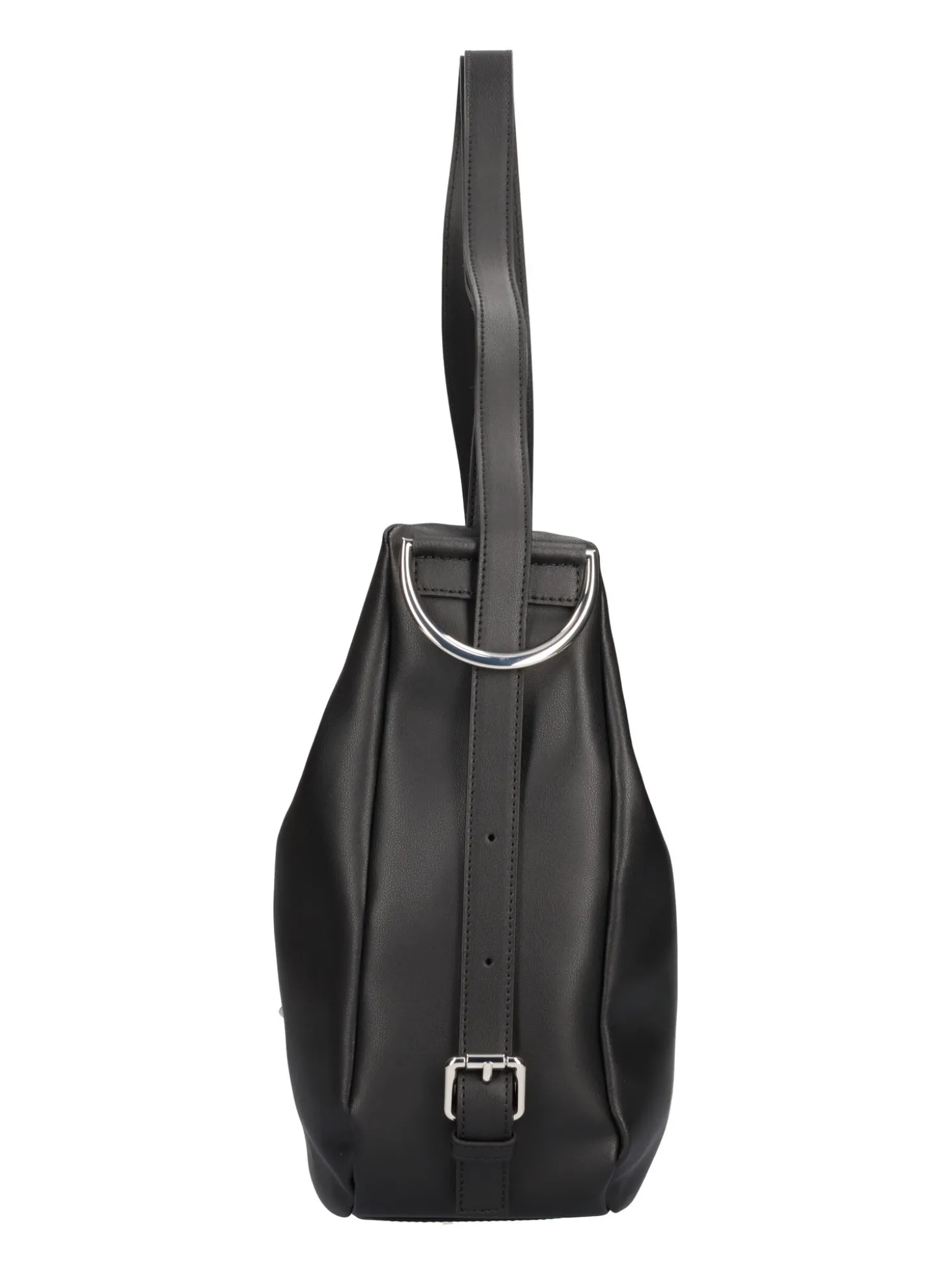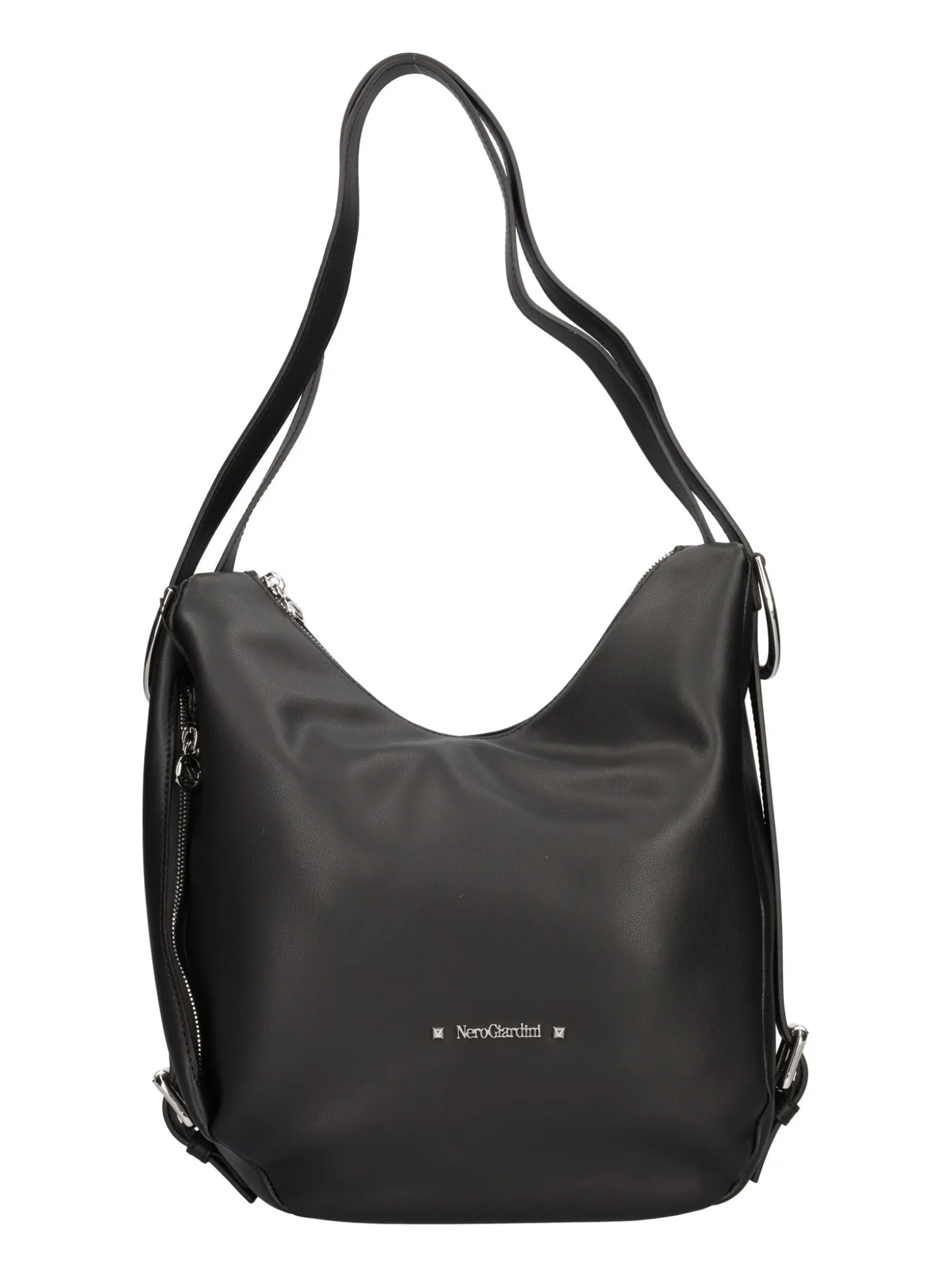 Shopping bag Nero Giardini da donna in morbida pelle nera con dettagli argento e manico regolabile. Zip centrale, taschino interno ed esterno.