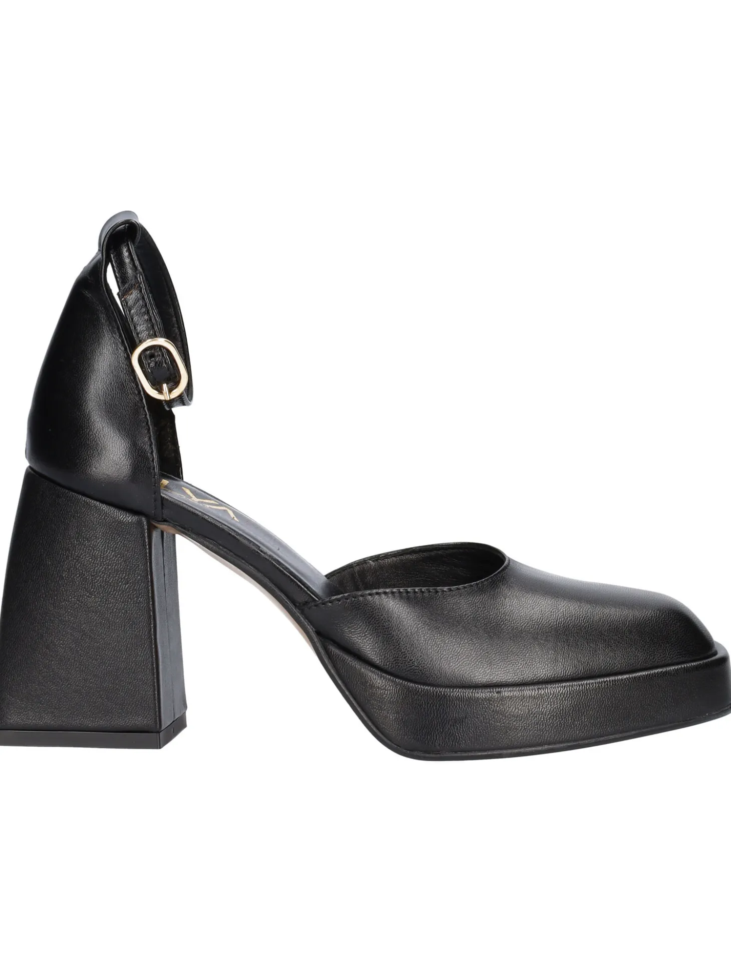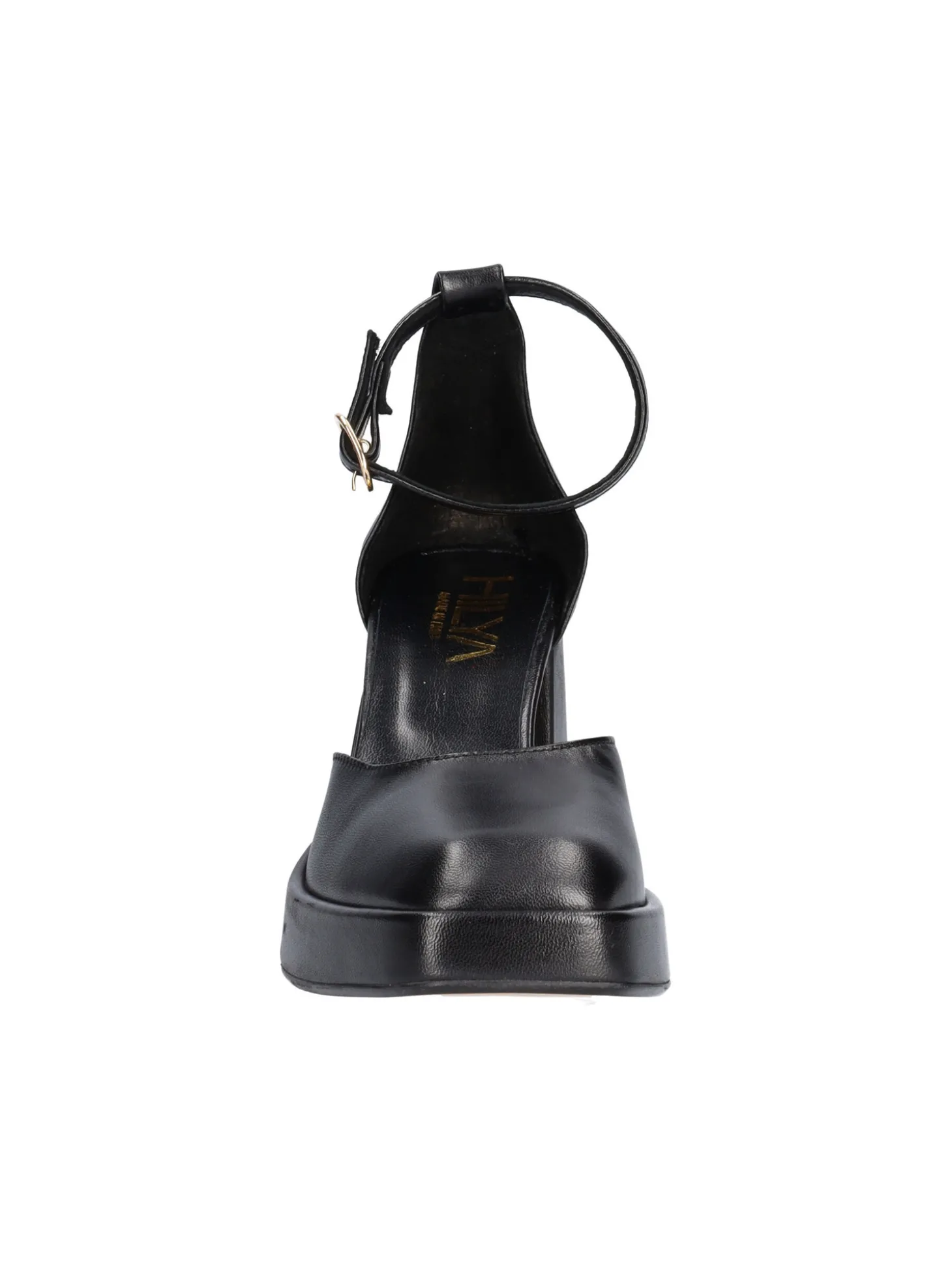 Scarpa con pumta quadrata Hilya da donna in pelle nera con cinturino regolabile, sottopiede sempre in pelle e fondo in gomma. Scarpa con tacco di 9cm e plateau di 2cm.