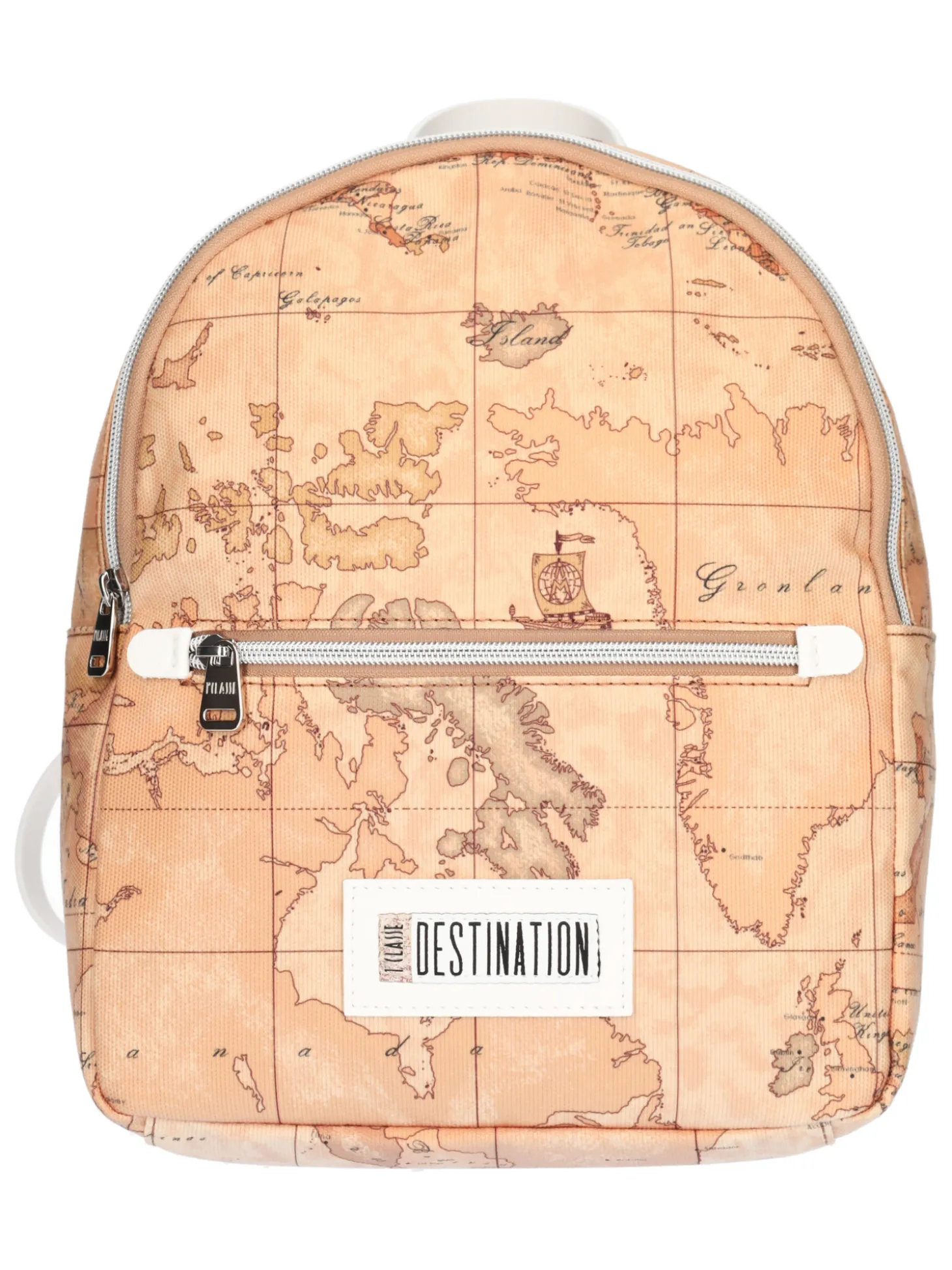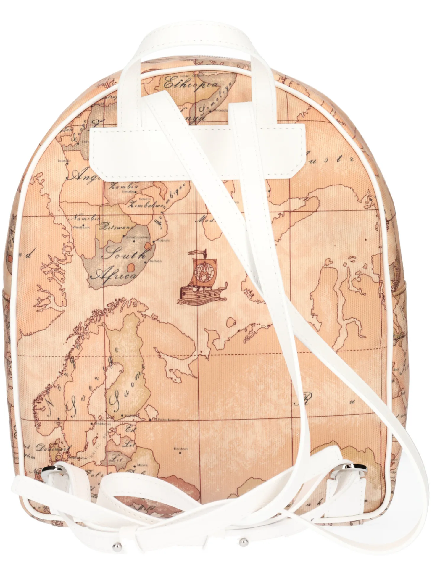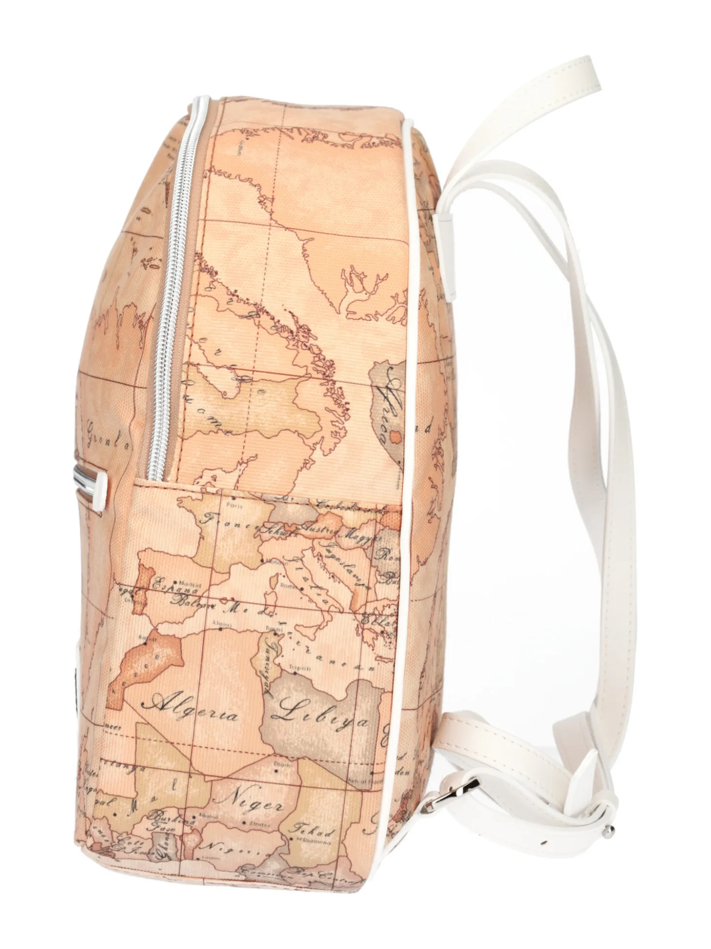Zaino Alviero Martini 1a Classe Destination da donna in tessuto geografico cuoio con dettagli in ecopelle bianca, zip centrale, taschini interni ed uno esterno.