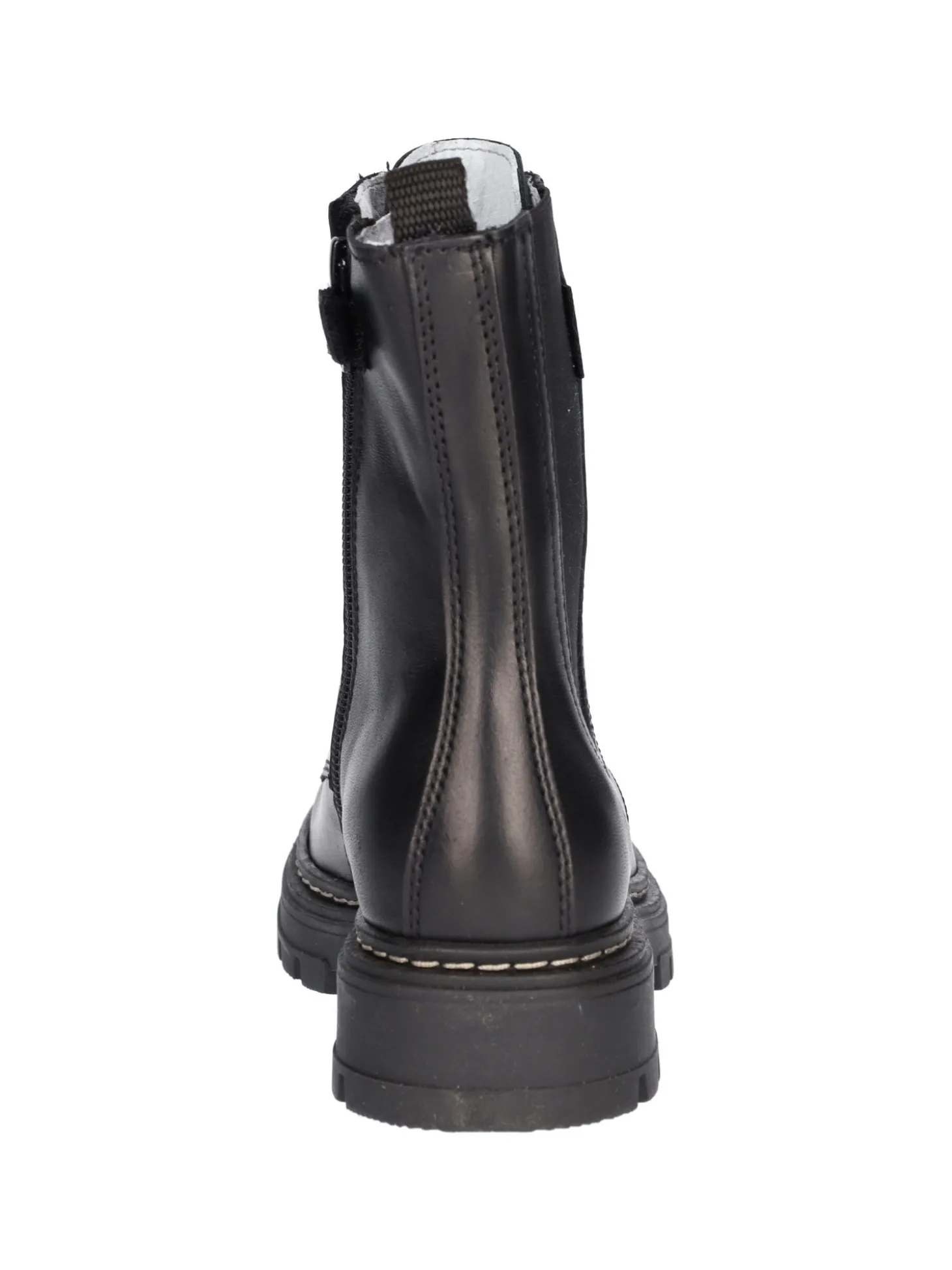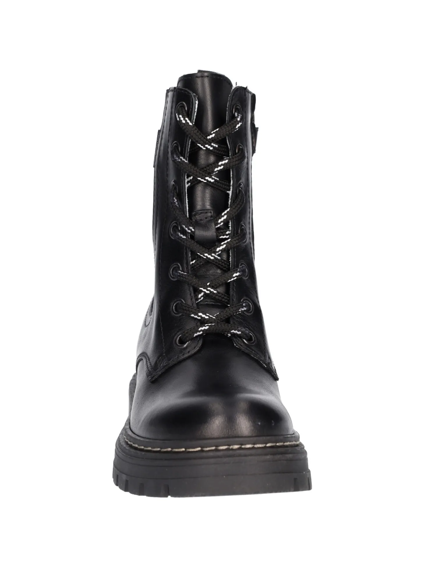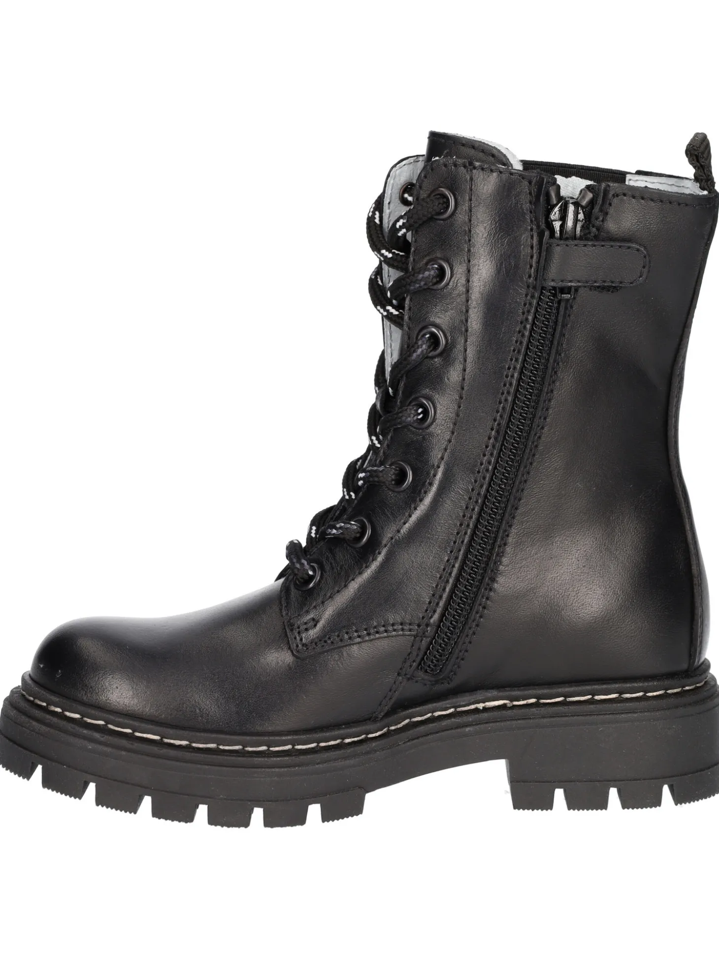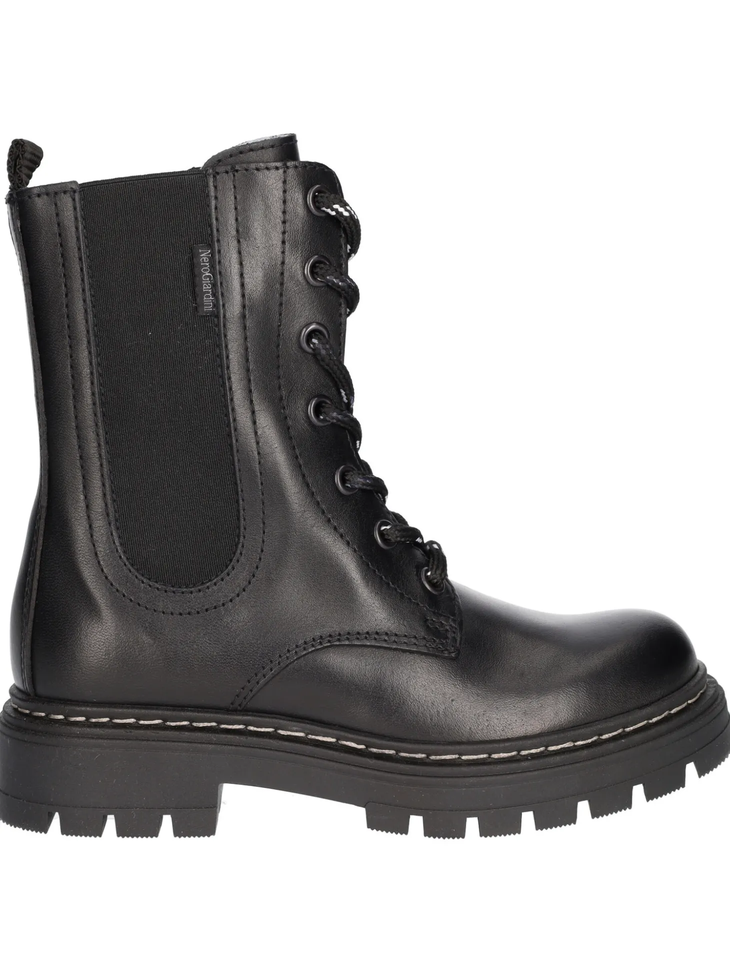 Anfibio Nero Giardini in pelle nera con elastico laterale tono su tono,laccio bianco e nero, zip interna e linguetta posteriore per una rapida calzata. Stivaletto con sottopiede in pelle e fondo in gomma antiscivolo.