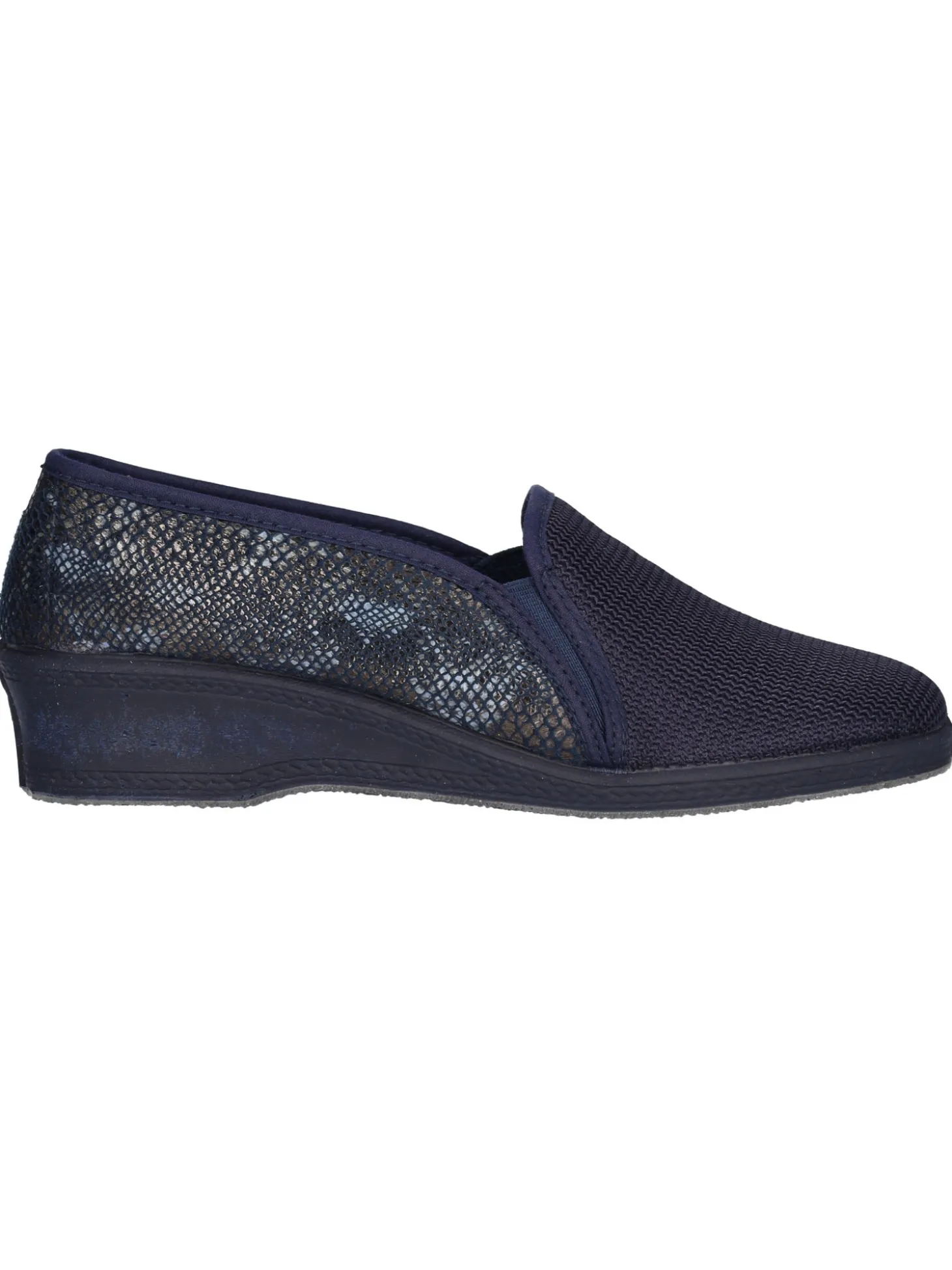 Ciabatta chiusa Davema da donna in tessuto blu con elastici laterali fondo in gomma antiscivolo con zeppa di 4cm.