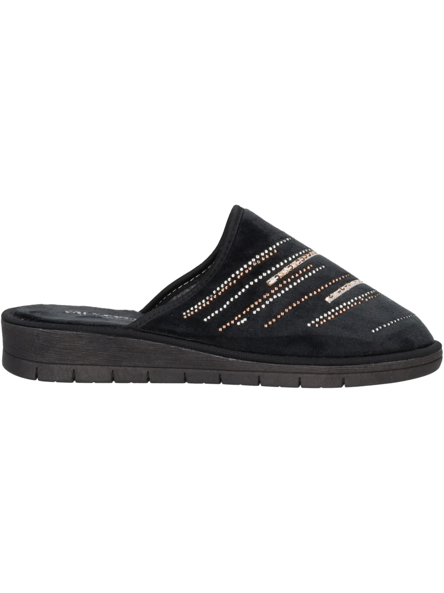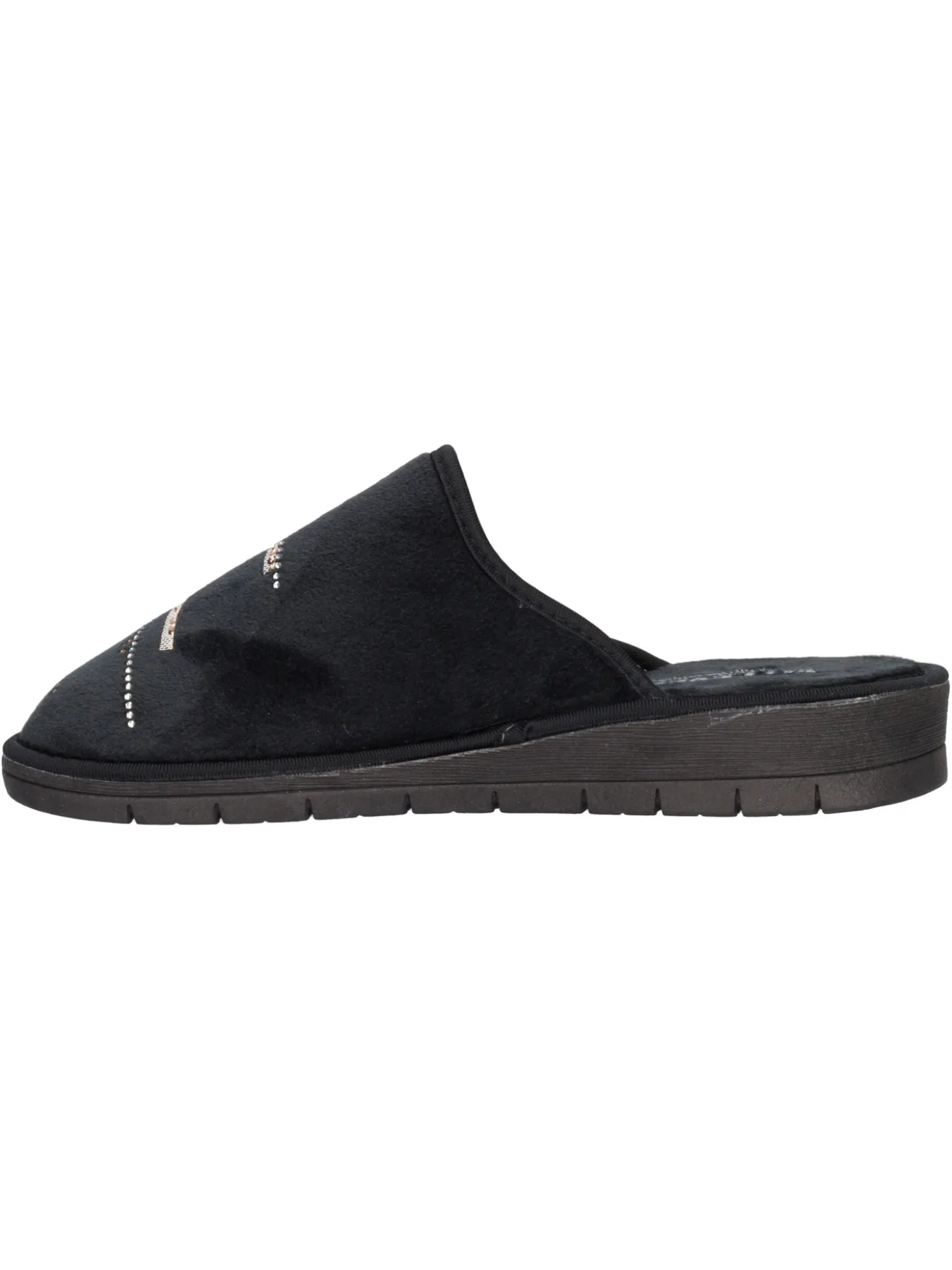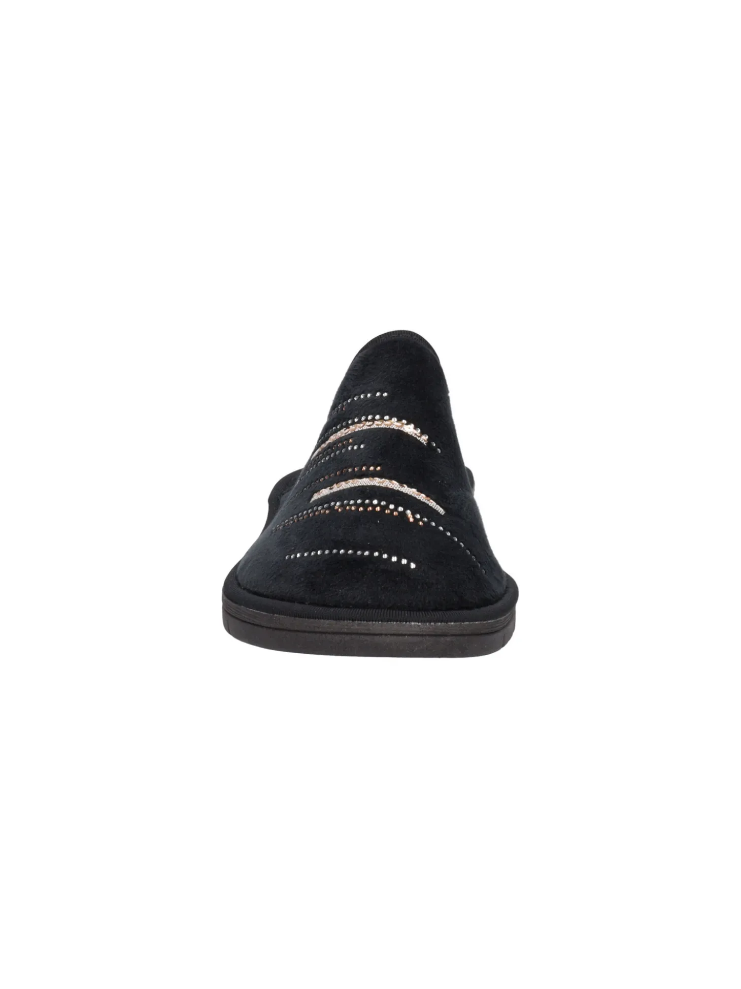Ciabatta Valleverde da donna in velluto nero con strass, fodera e sottopiede in tessuto e velluto e fondo in gomma.