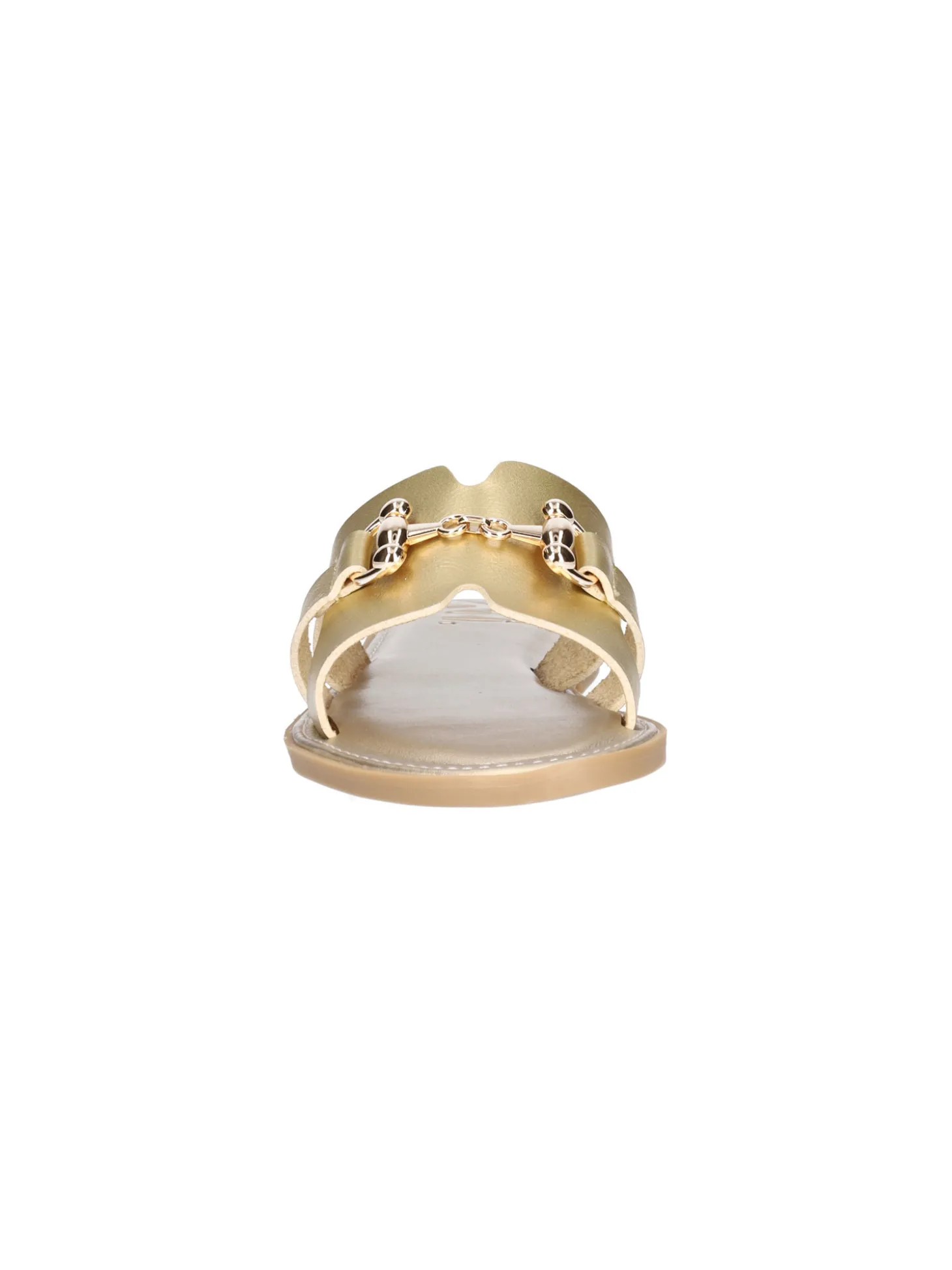 Sandalo Xti Vegan da donna in ecopelle metallizzata oro con morsetto, sottopiede imbottito e fondo in gomma antiscivolo.