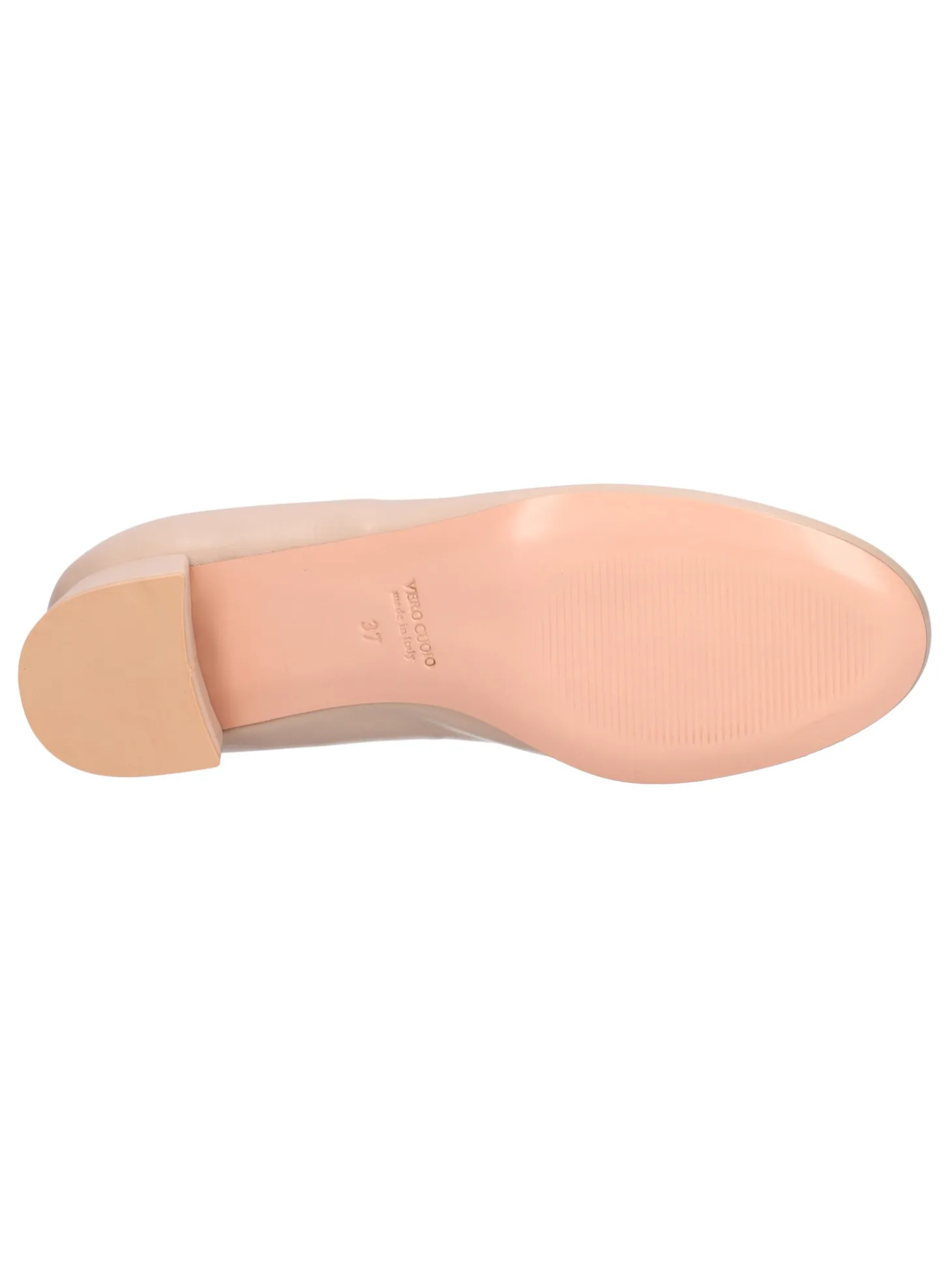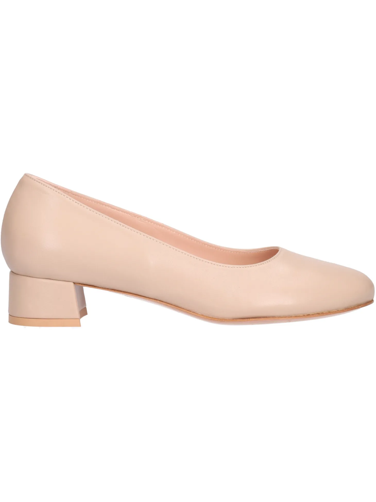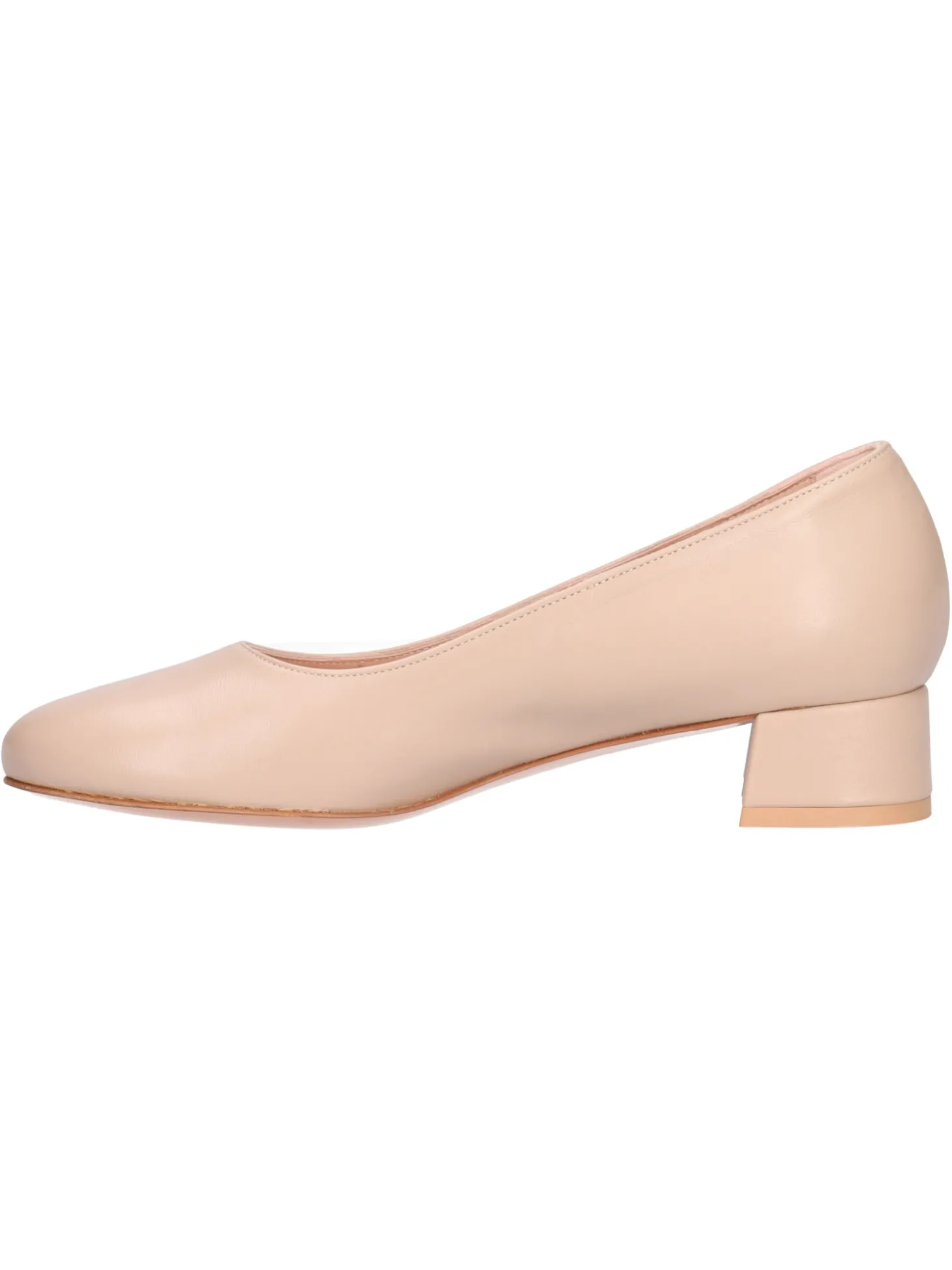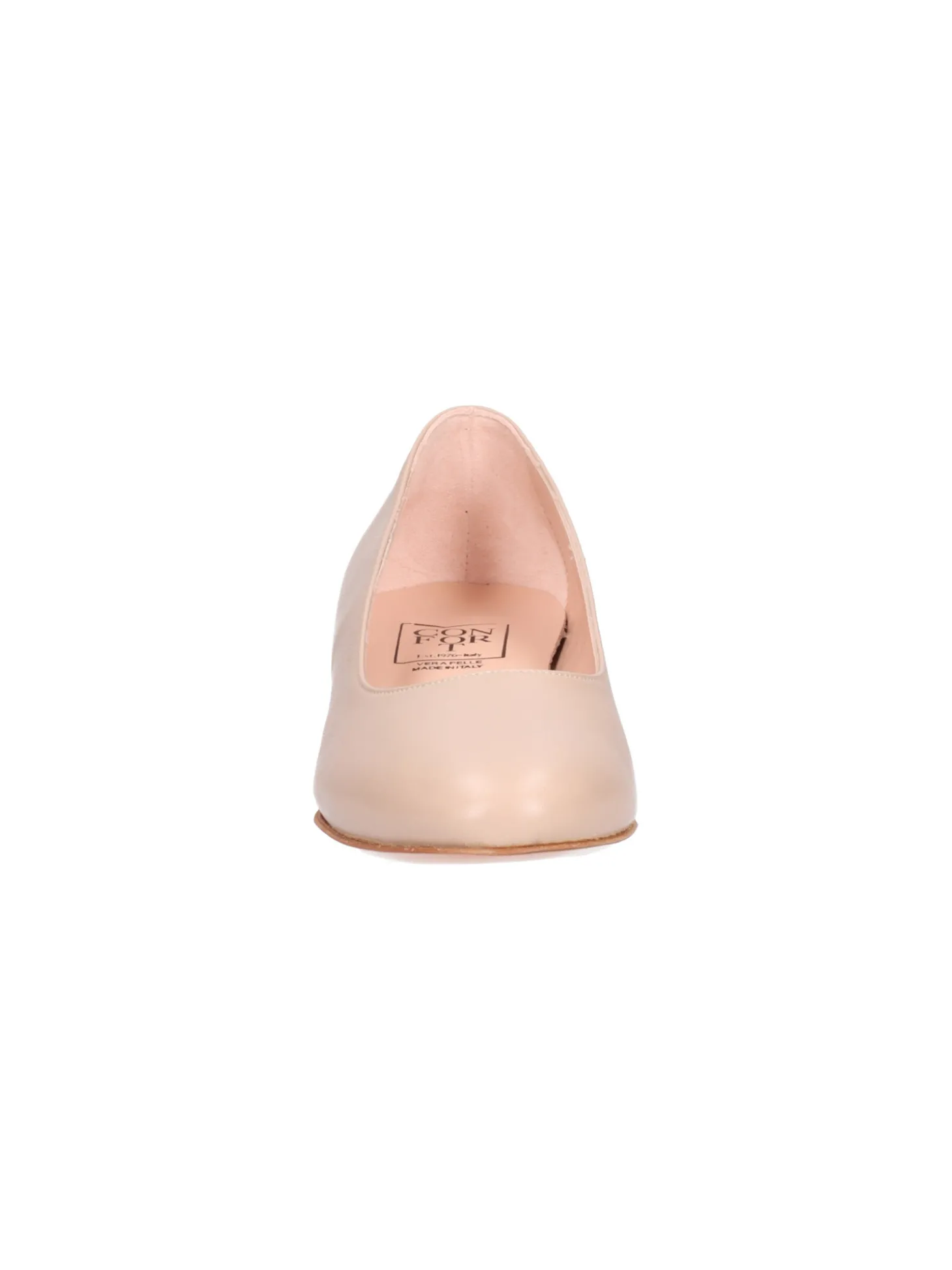 Decollete Confort da donna in pelle beige con morbido sottopiede sempre in pelle e fondo in gomma con inserti in vero cuoio e tacco di 3cm. Ideale per assistenti di volo, receptionist e per chiunque necessita di un decollete comodo da indossare sotto la divisa.