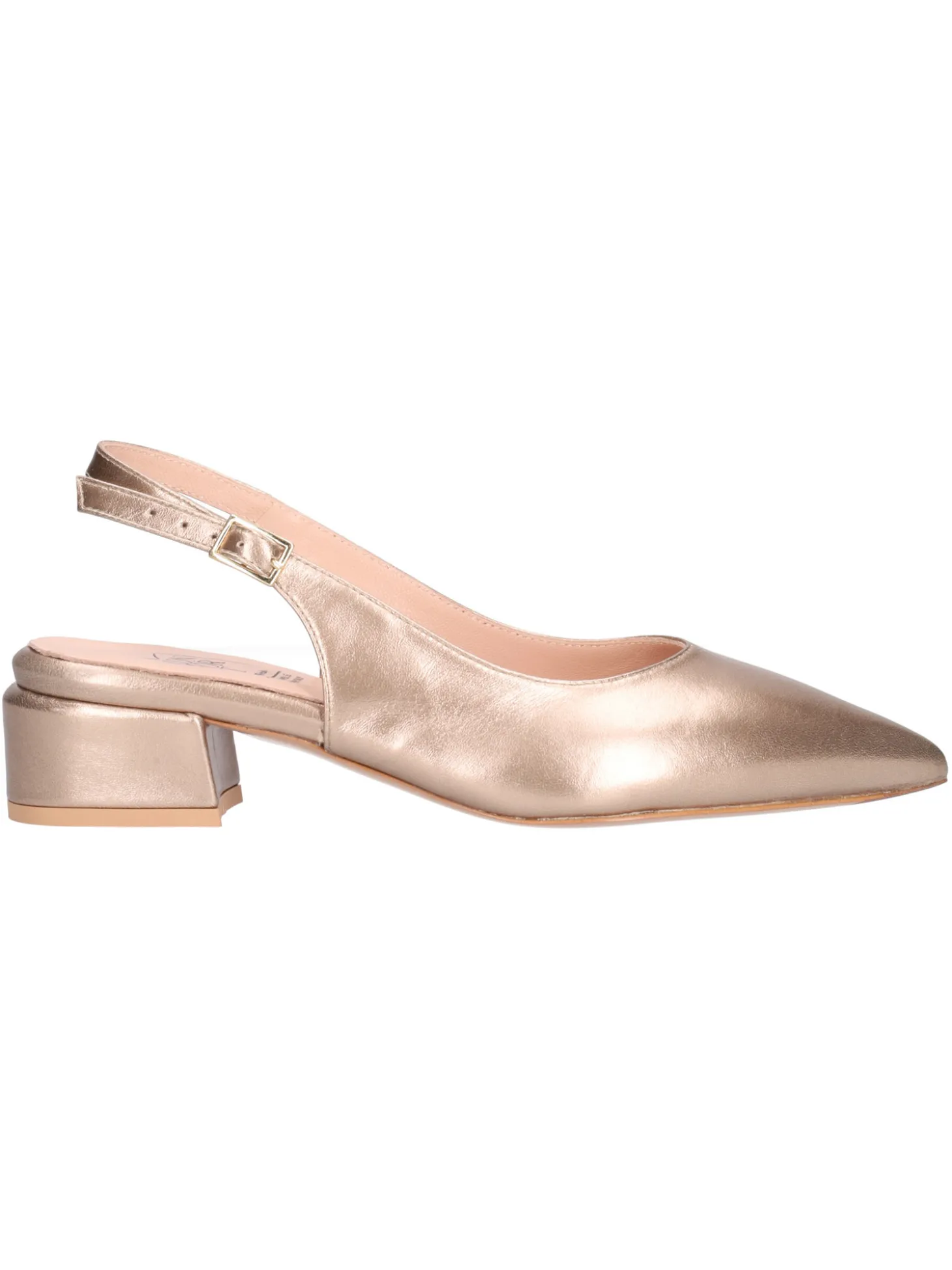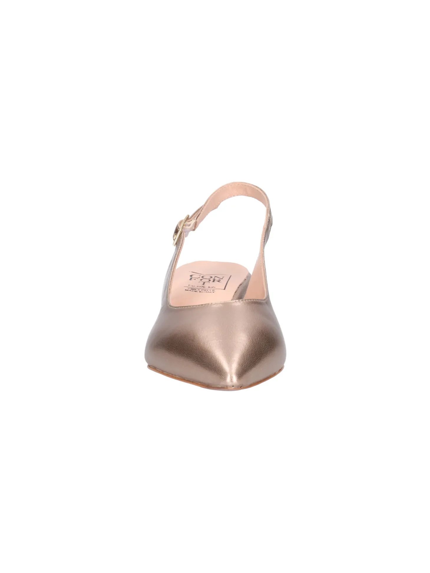 Decollete modello chanel Confort da donna in pelle laminata bronzo con punta e cinturino regolabile. Sottopiede imbottito in pelle, fondo in gomma e tacco di 4cm.