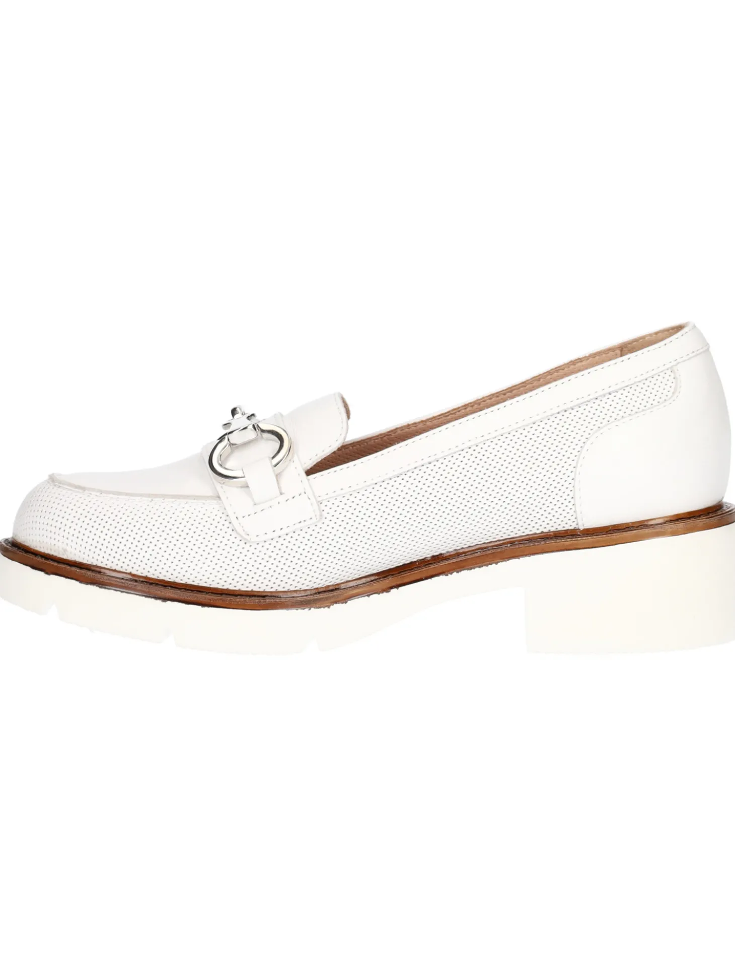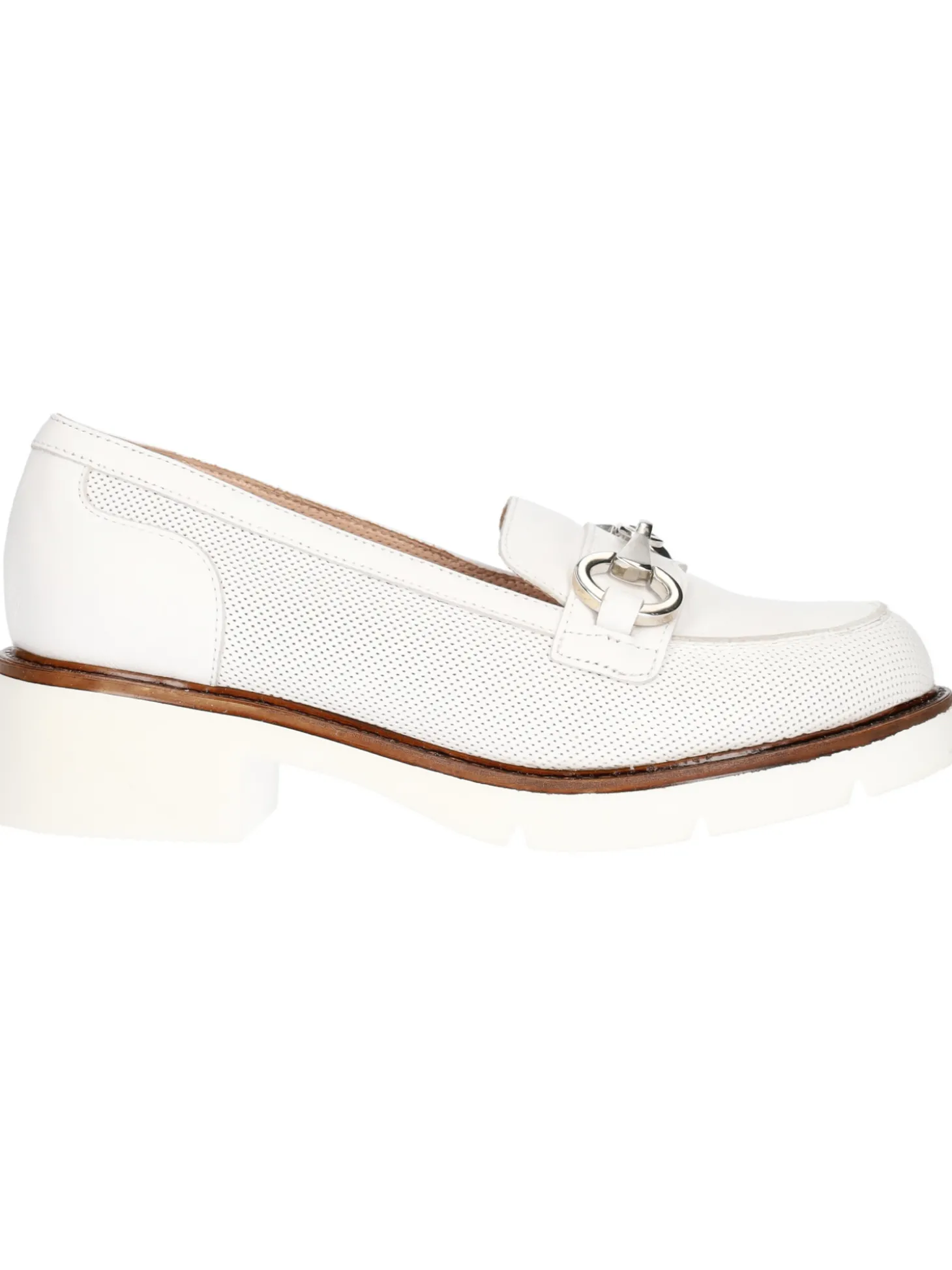 Mocassino Confort da donna in pelle bianca traforata con fodera e sottopiede sempre in pelle e fondo in gomma antiscivolo con tacco di 4cm.
