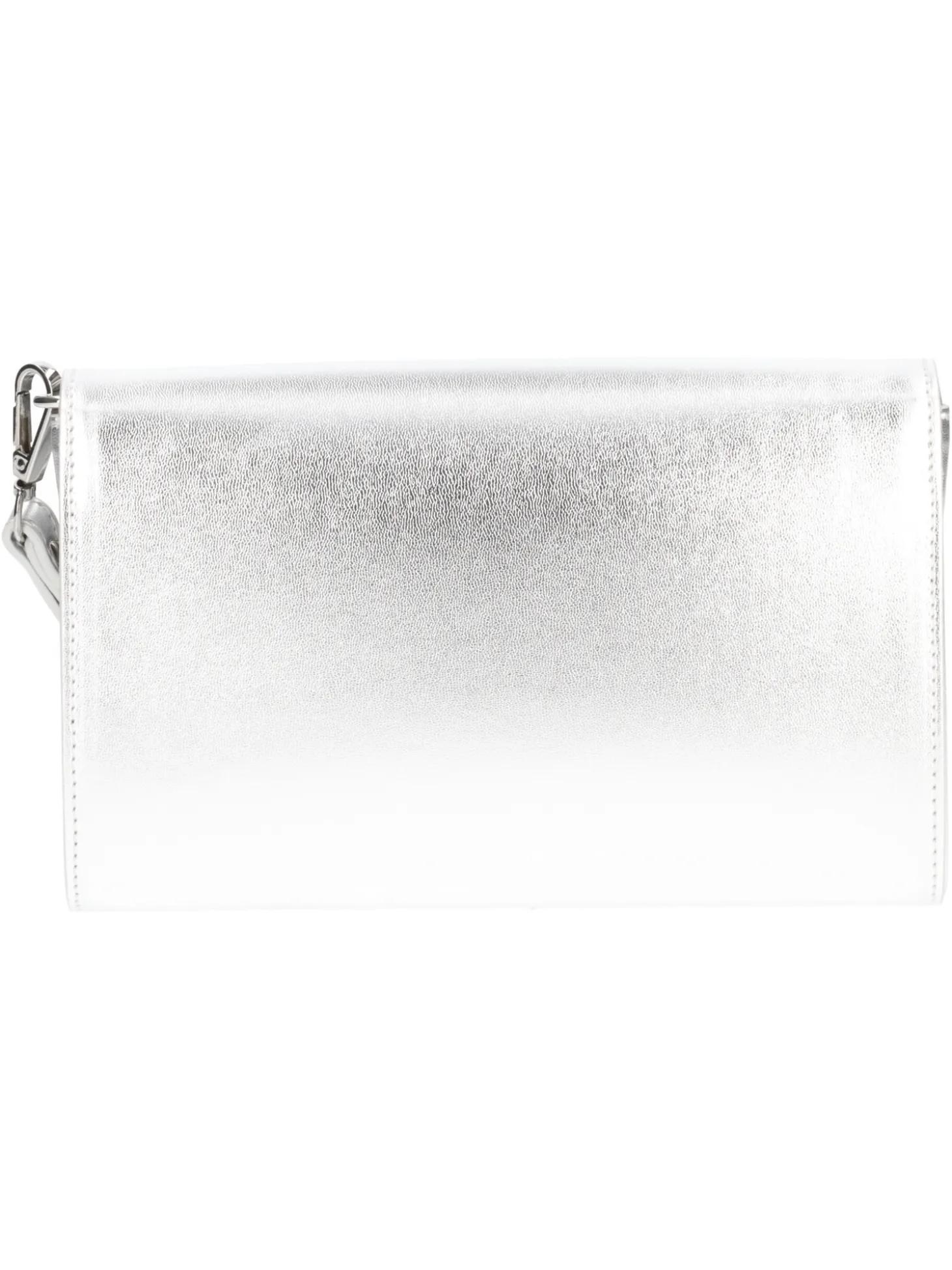 Pochette Nero Giardini da donna in ecopelle laminata argento con manico da polso e tracolla di catena chiusura con automatico senza zip centrale.