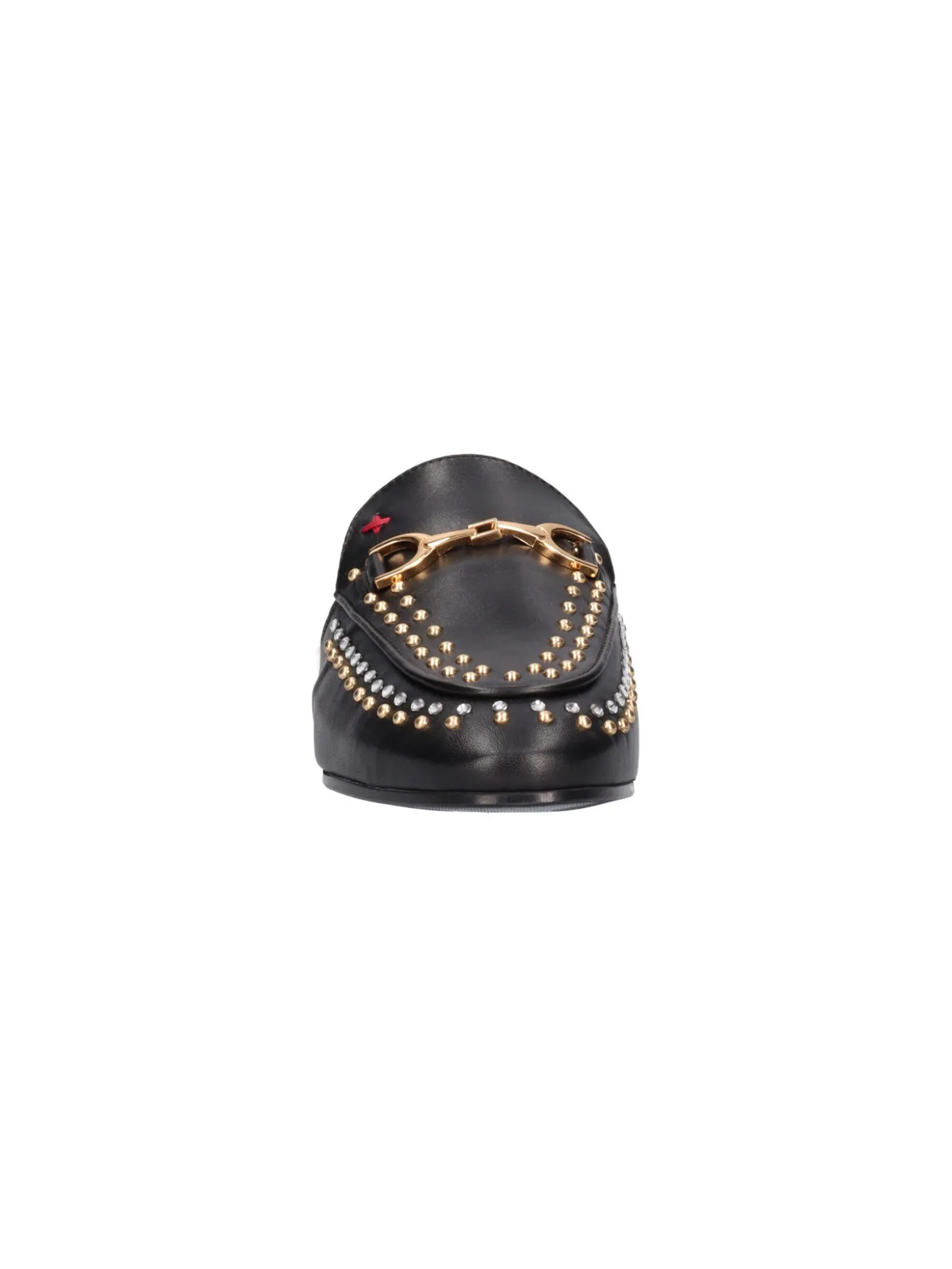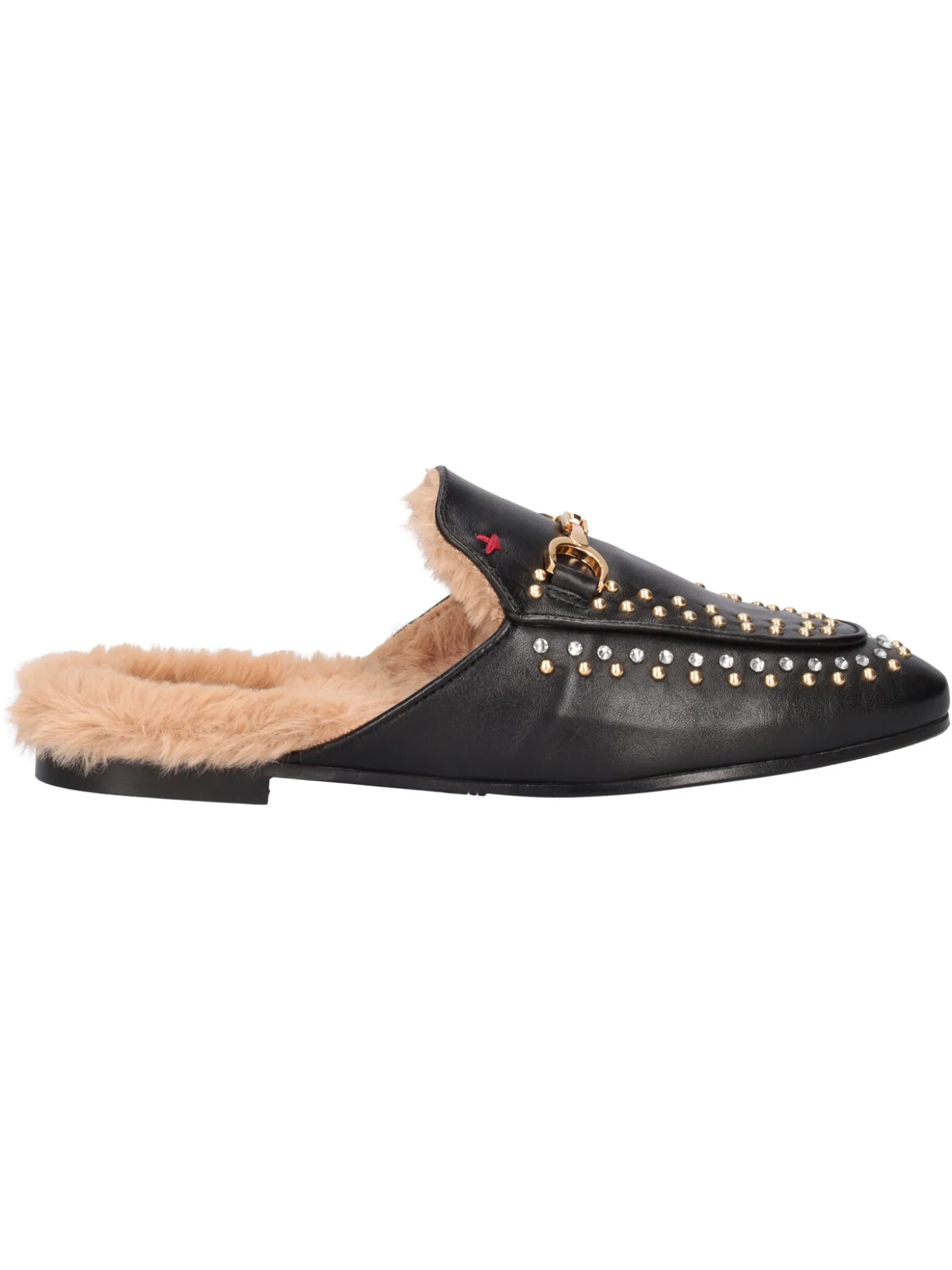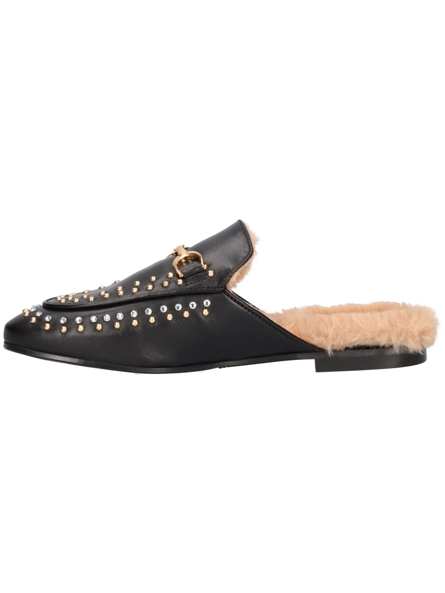 Sabot Gio+ da donna in pelle nera con borchie e morsetto, fodera e sottopiede in pelliccia e fondo in gomma.