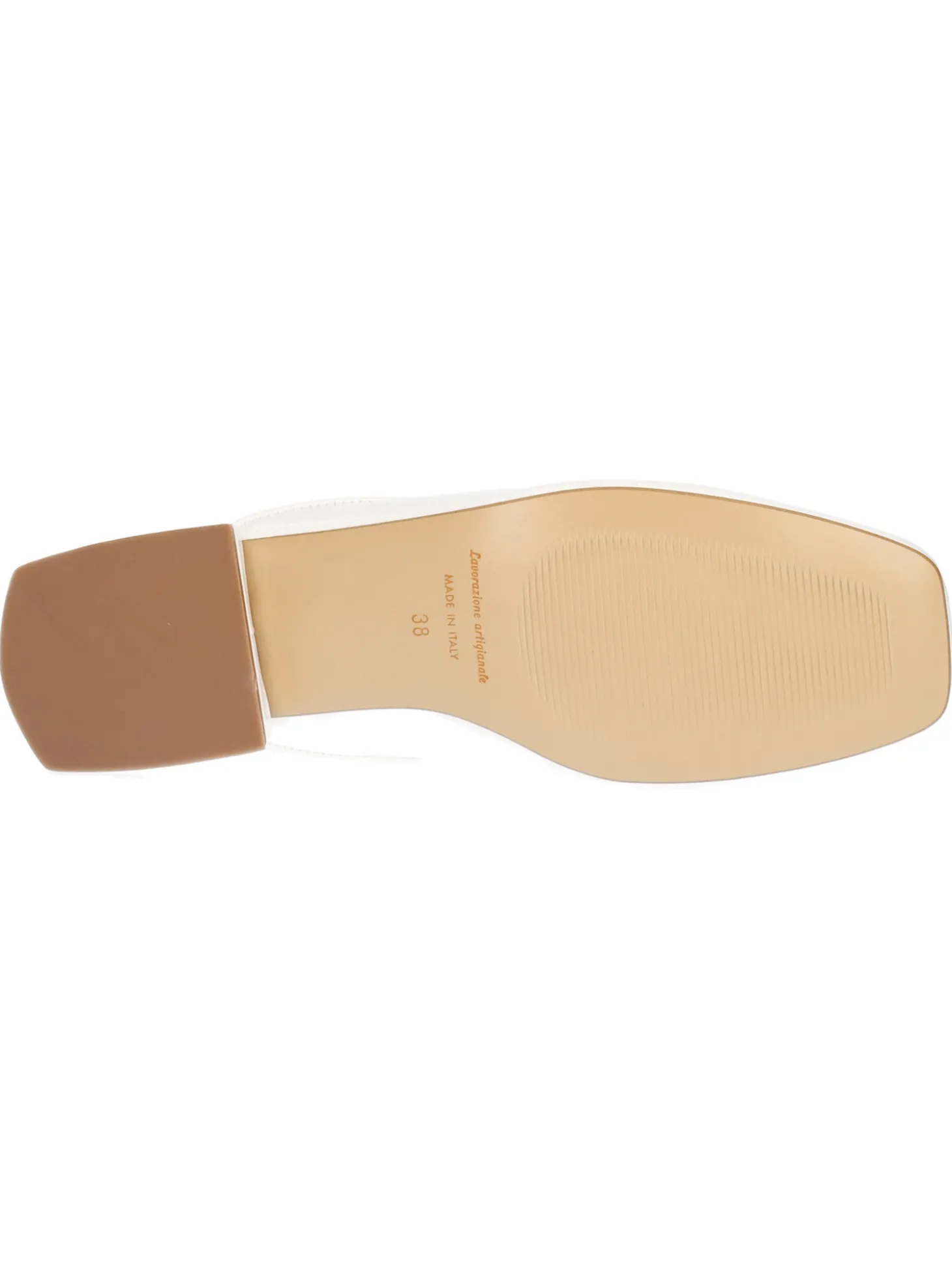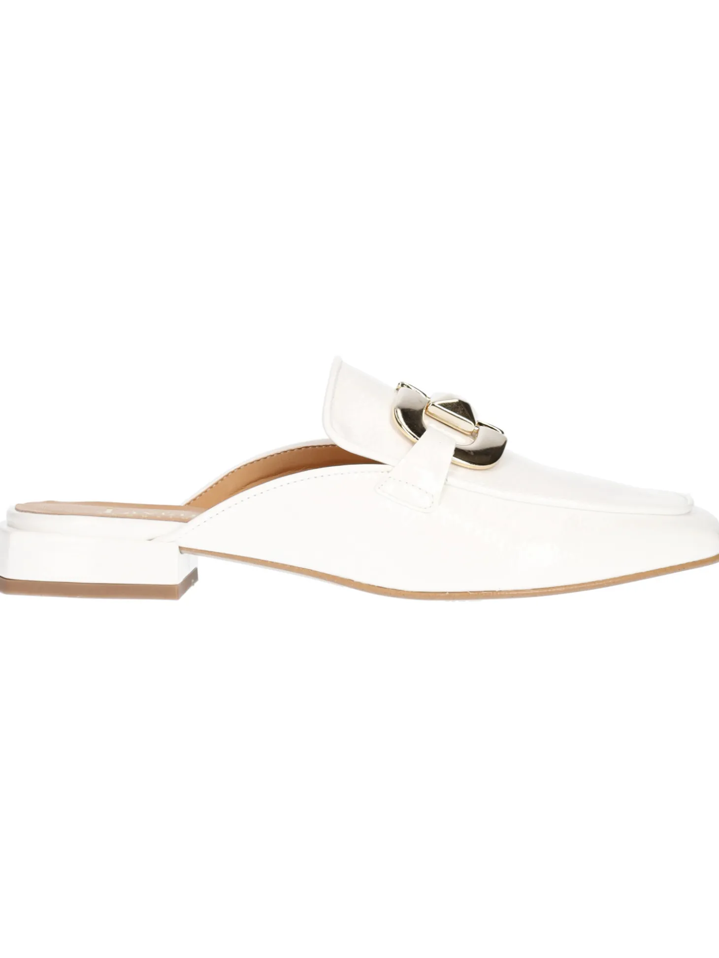Sabot Liviana da donna in vernice bianca con accessorio dorato, sottopiede imbottito in vera pelle con tacco di 2cm.