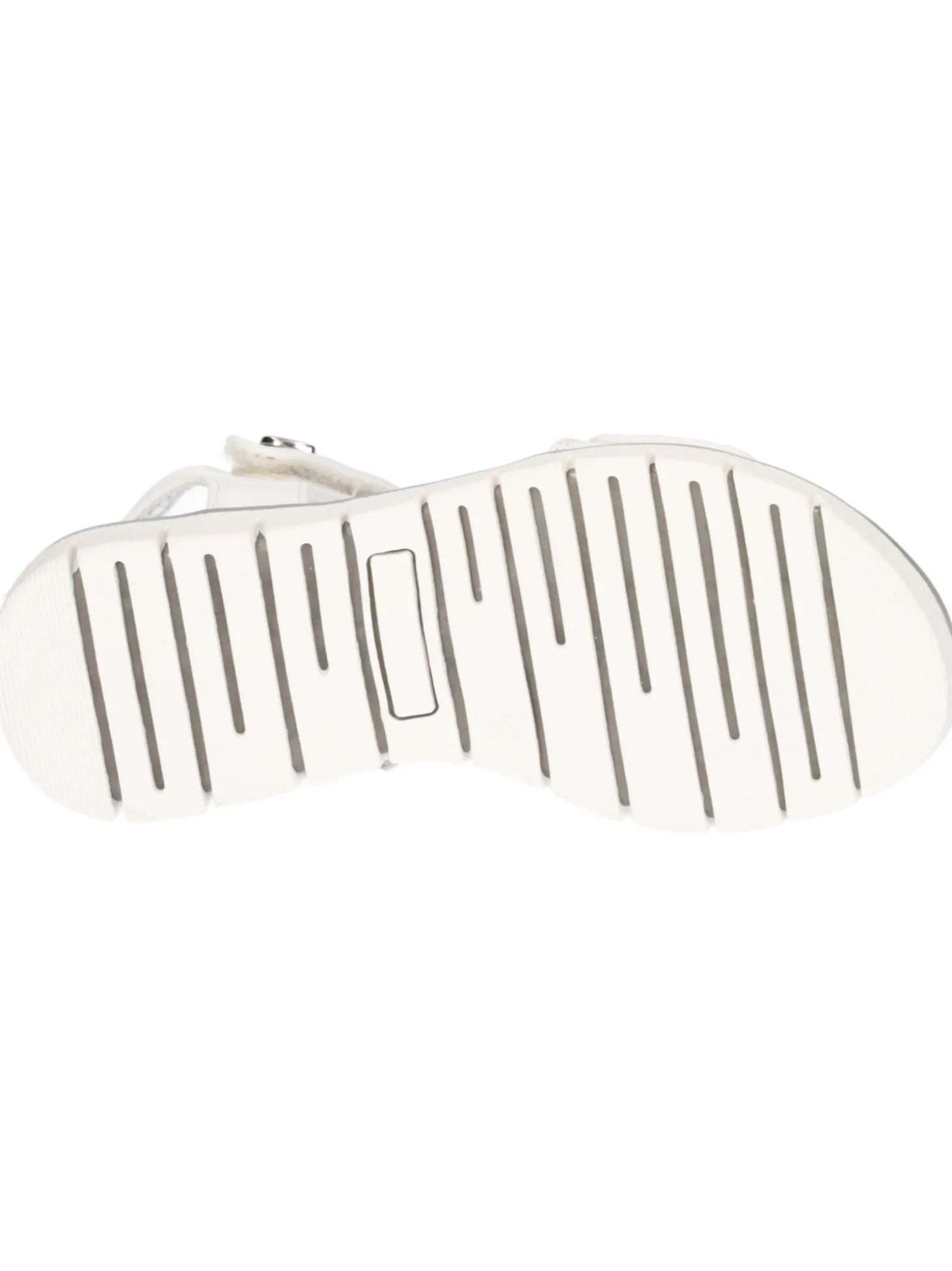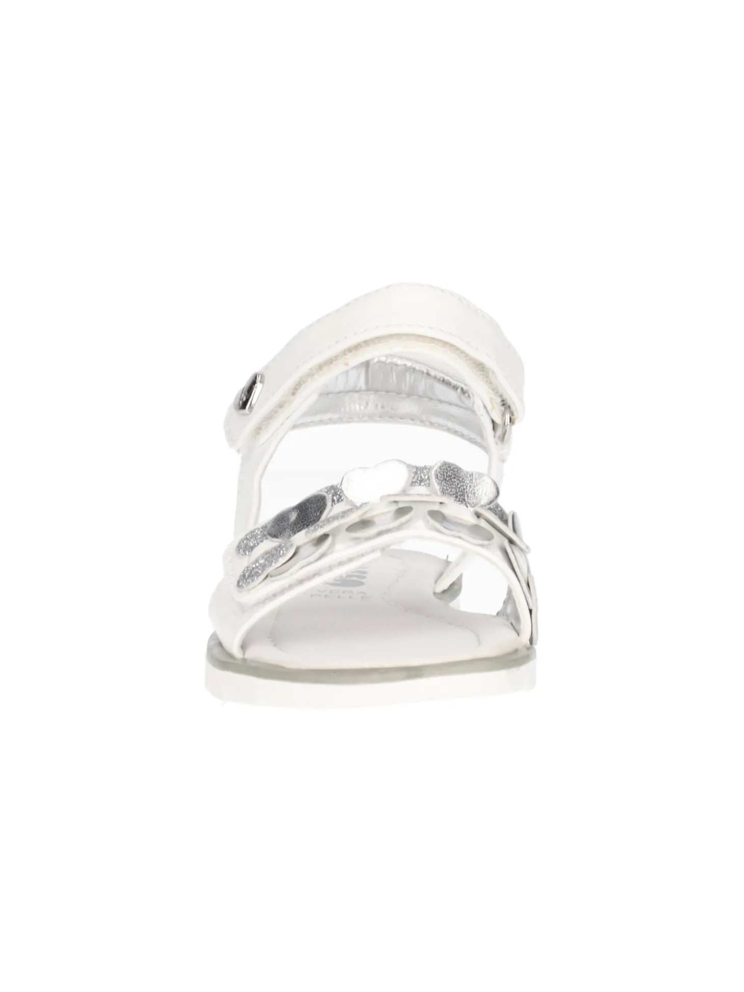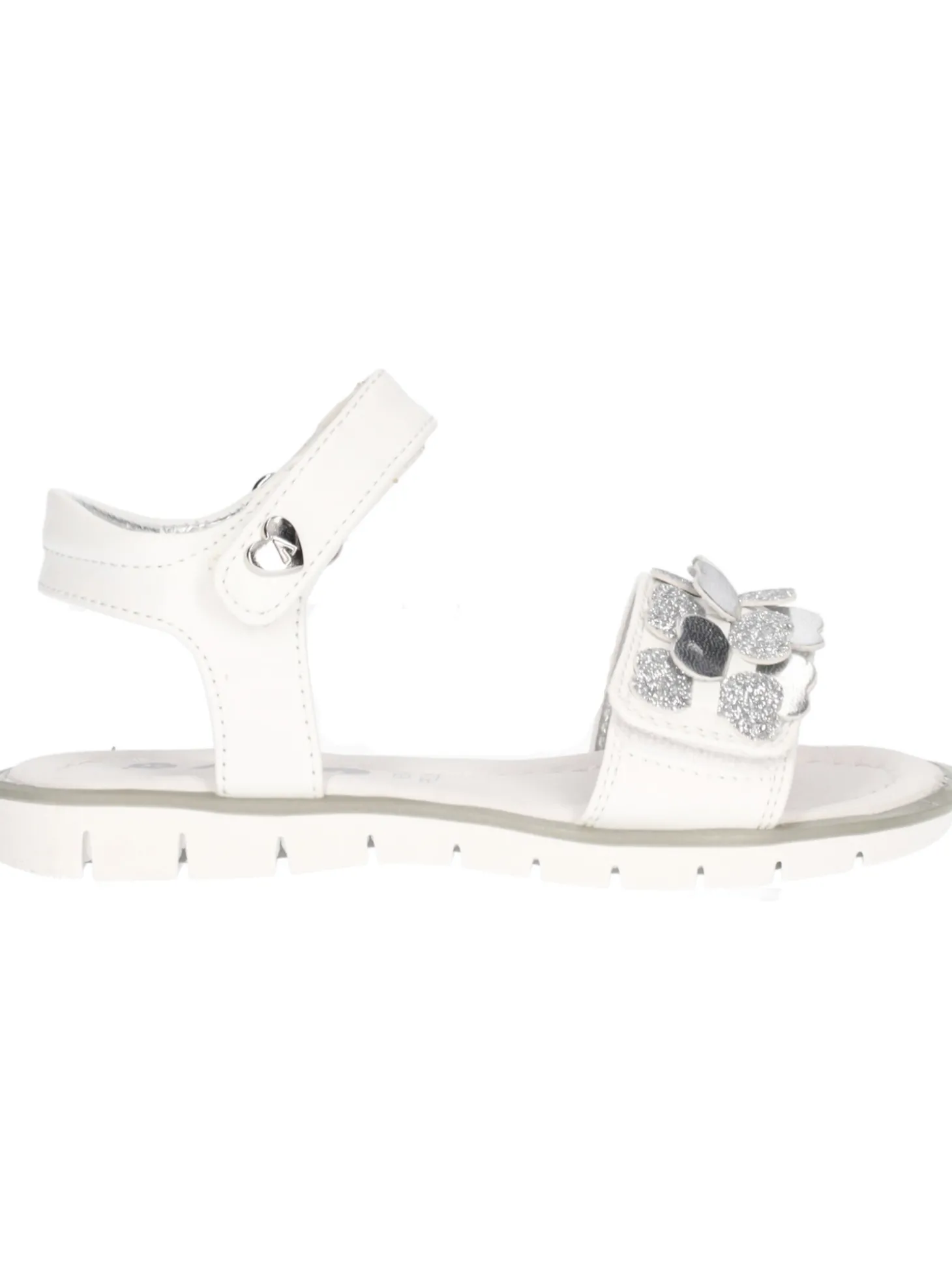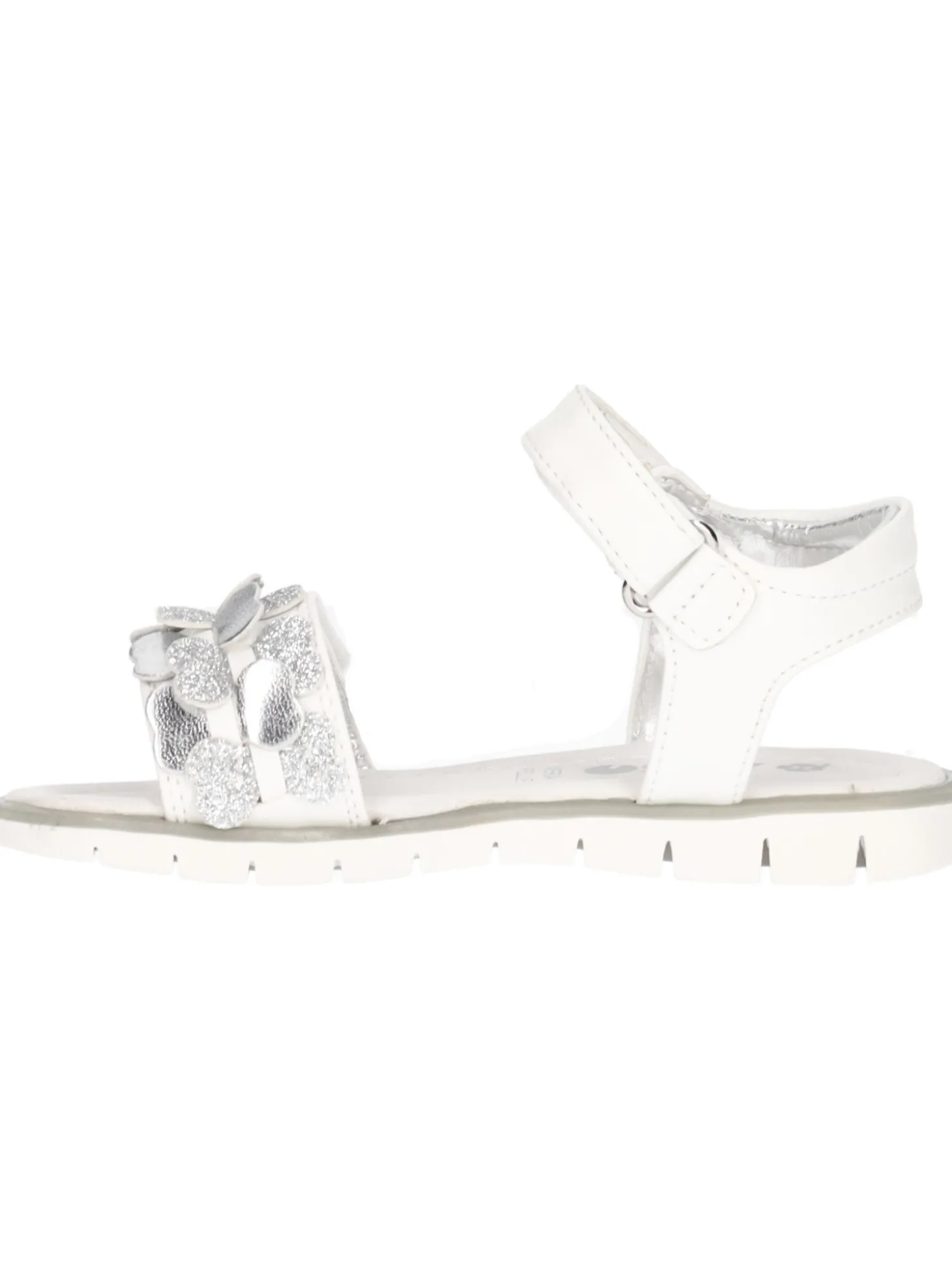 Sandalo Asso da bambina in ecopelle bianca con dettagli argento e stretch regolabili sottopiede in vera pelle e fondo in gomma.