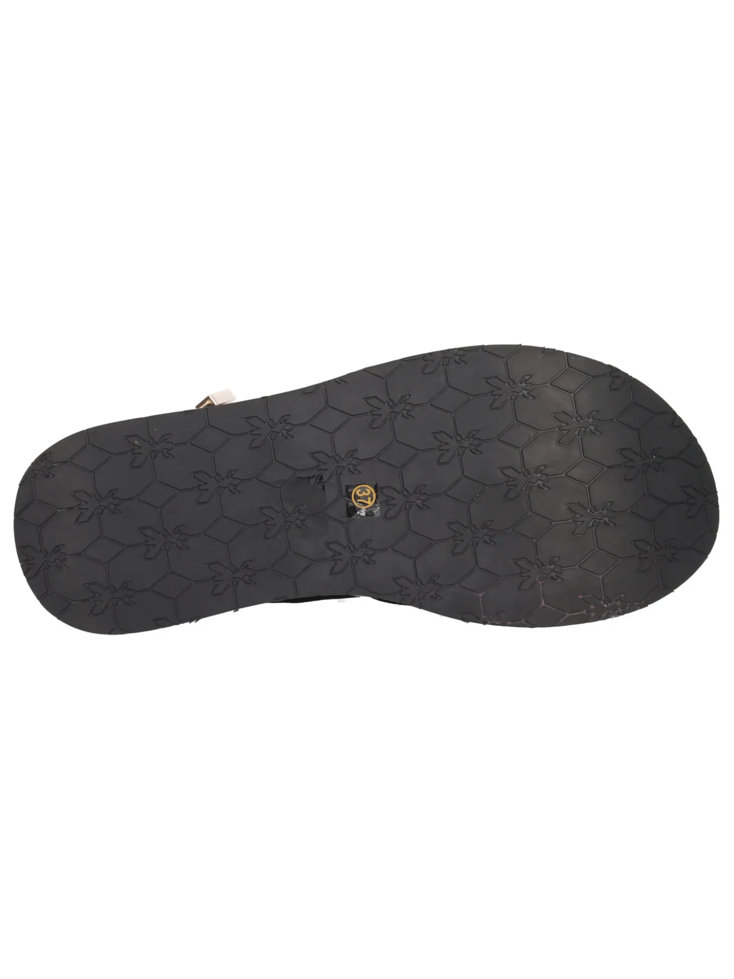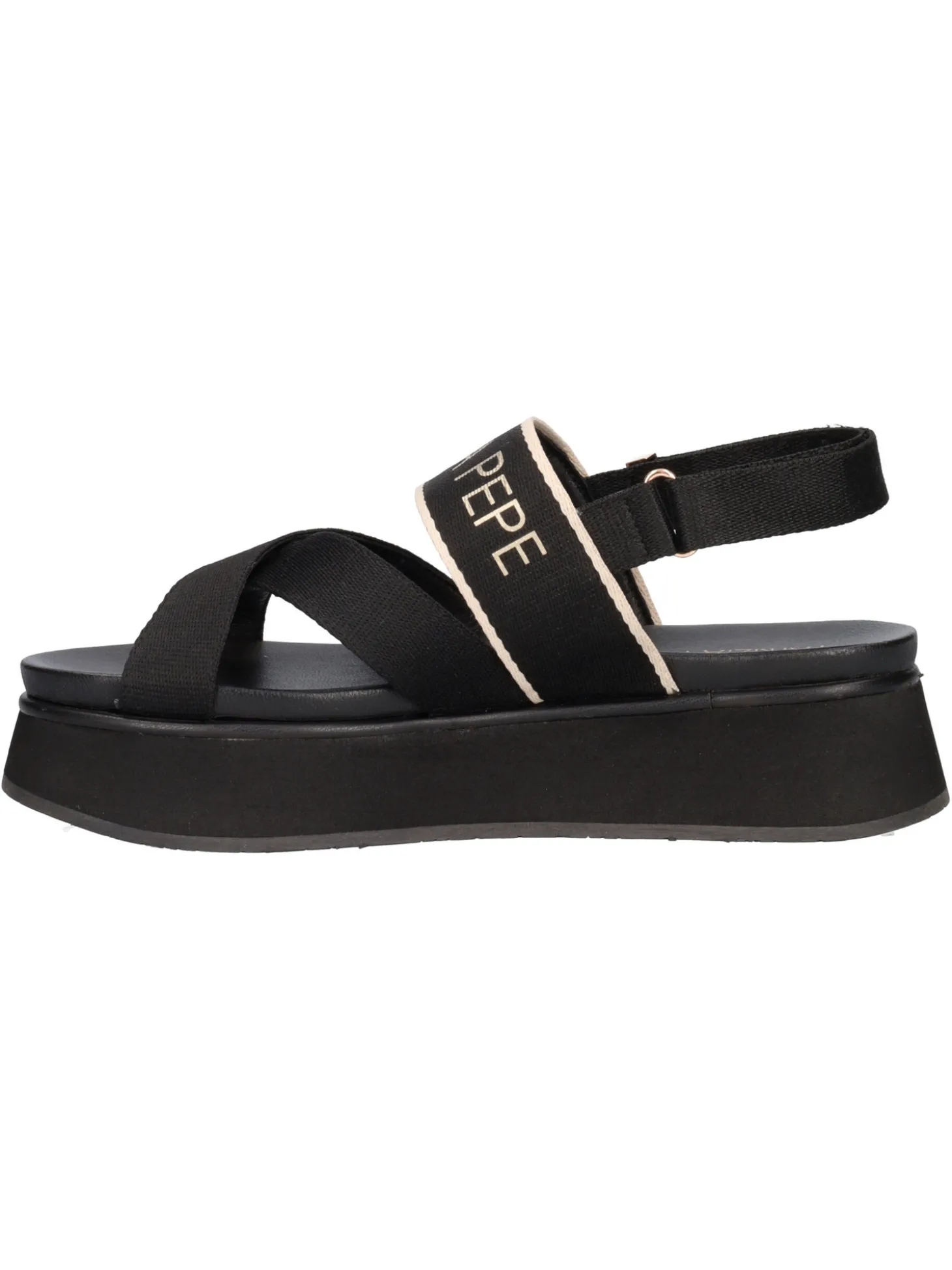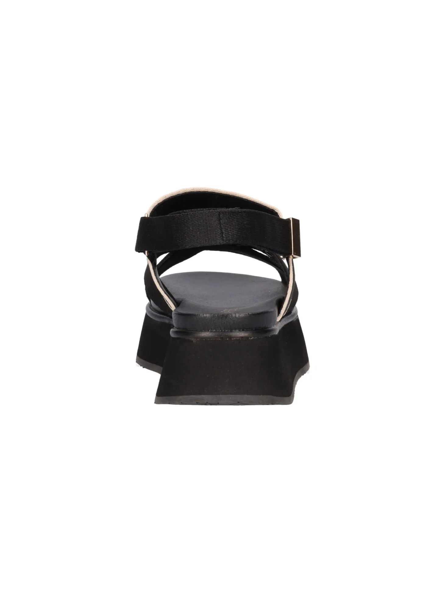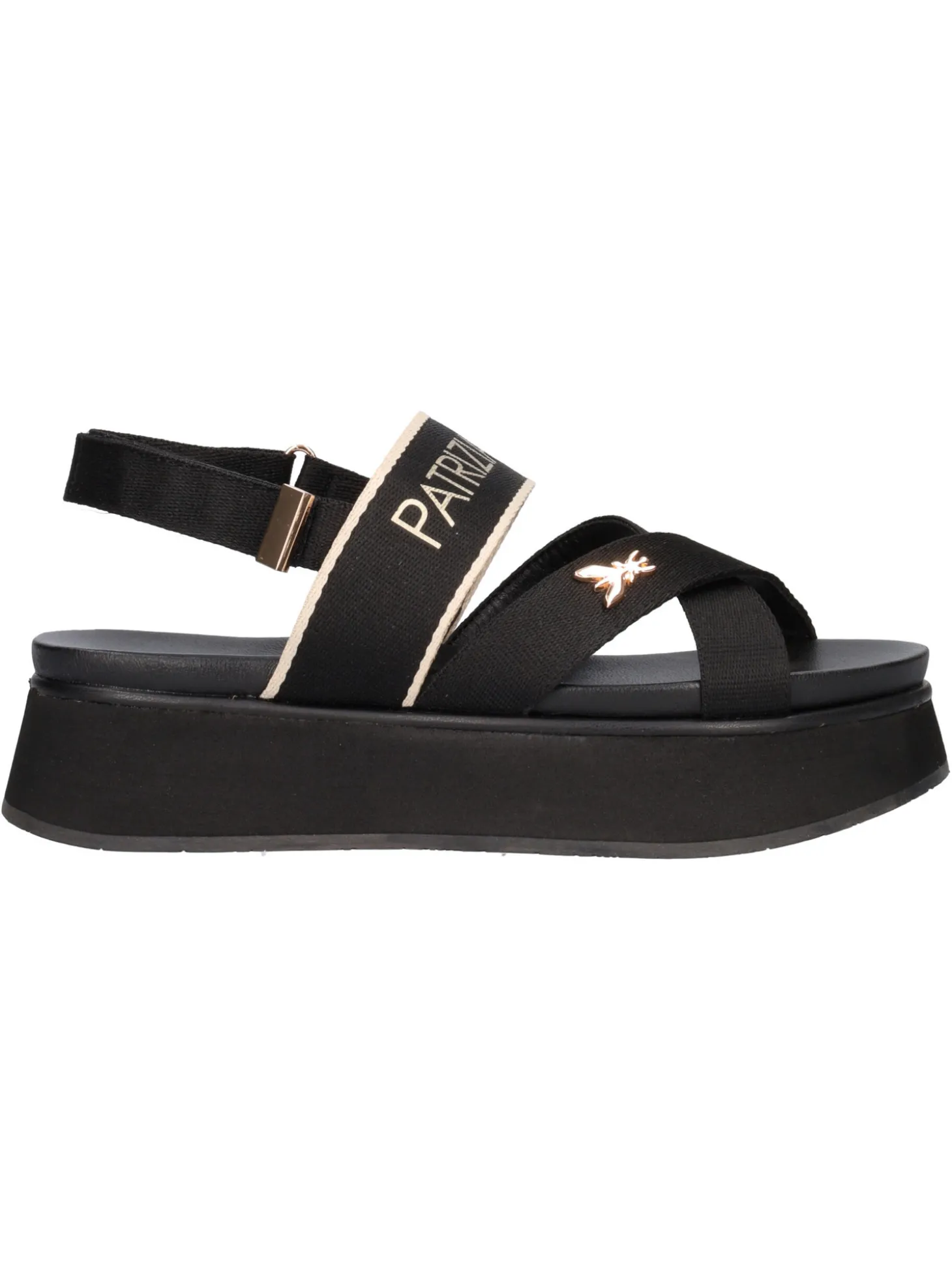 Sandalo Patrizia Pepe da donna in tessuto nero con stretch regolabile e accessorio dorato sottopiede sempre in pelle, fondo in gomma e platform di 4cm.