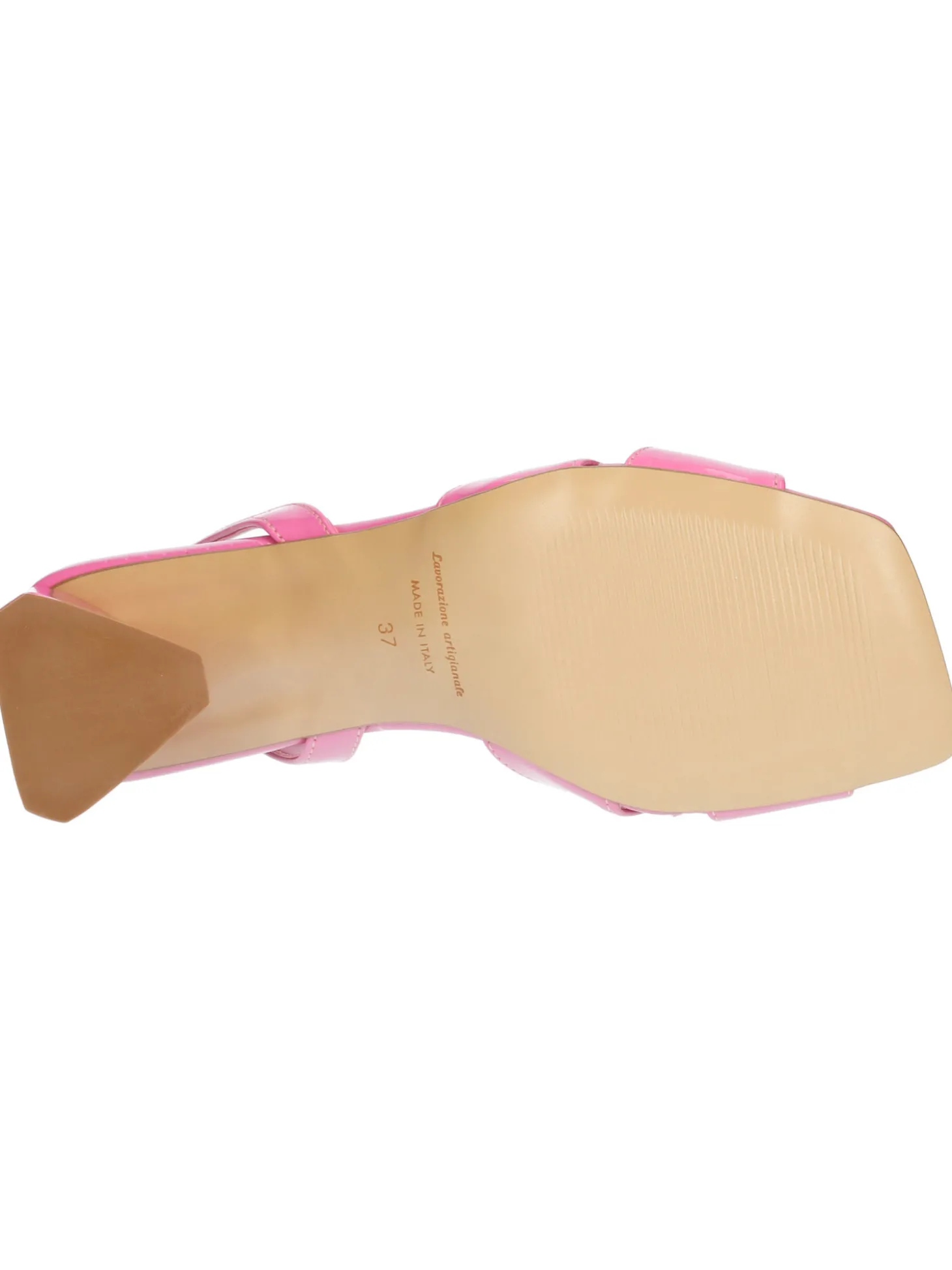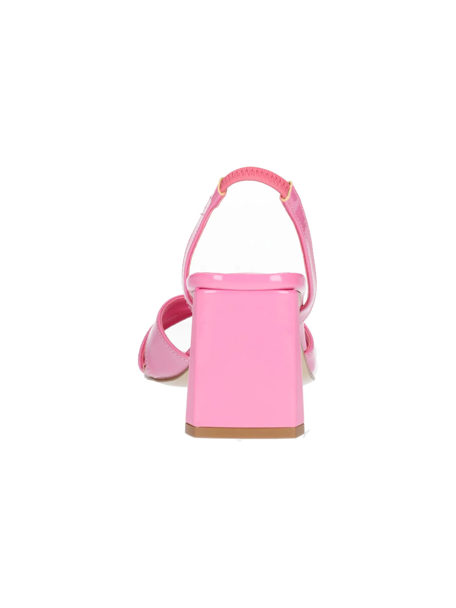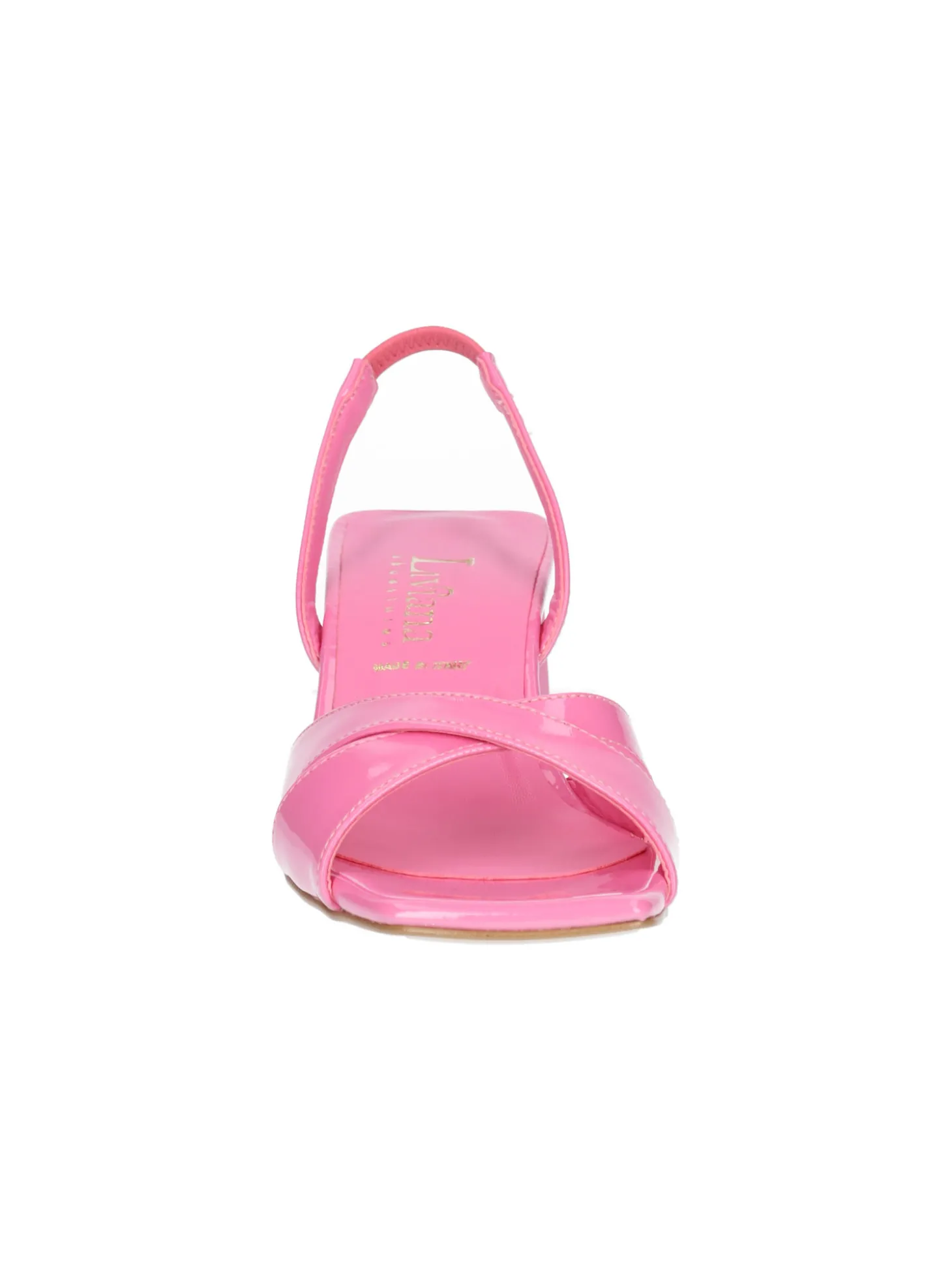 Sandalo Liviana da donna in vernice fucsia con punta quadrata e cinturino elastico sottopiede in vera pelle, fondo in gomma e tacco di 7cm.