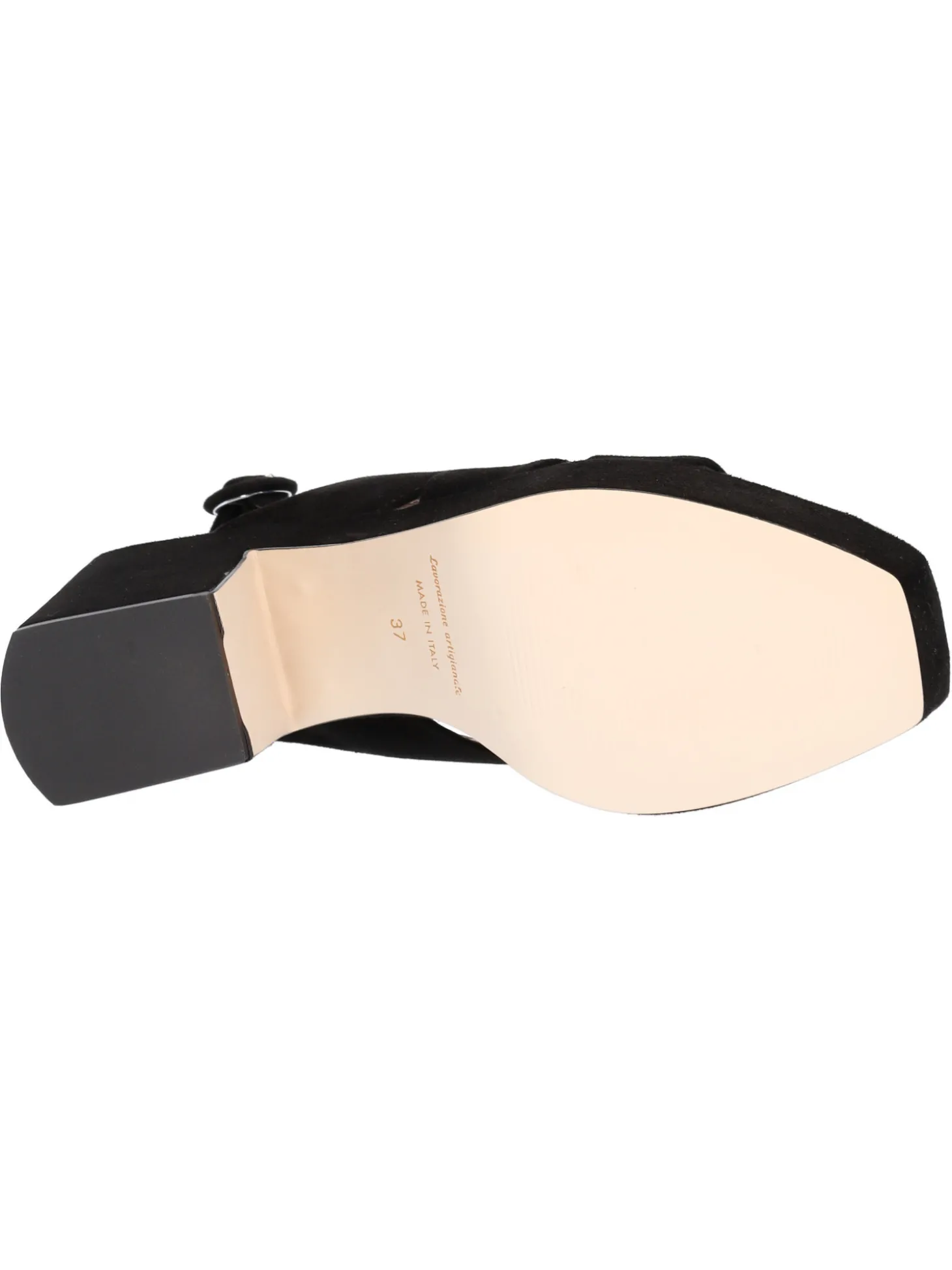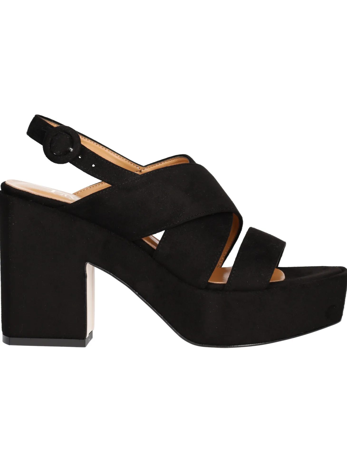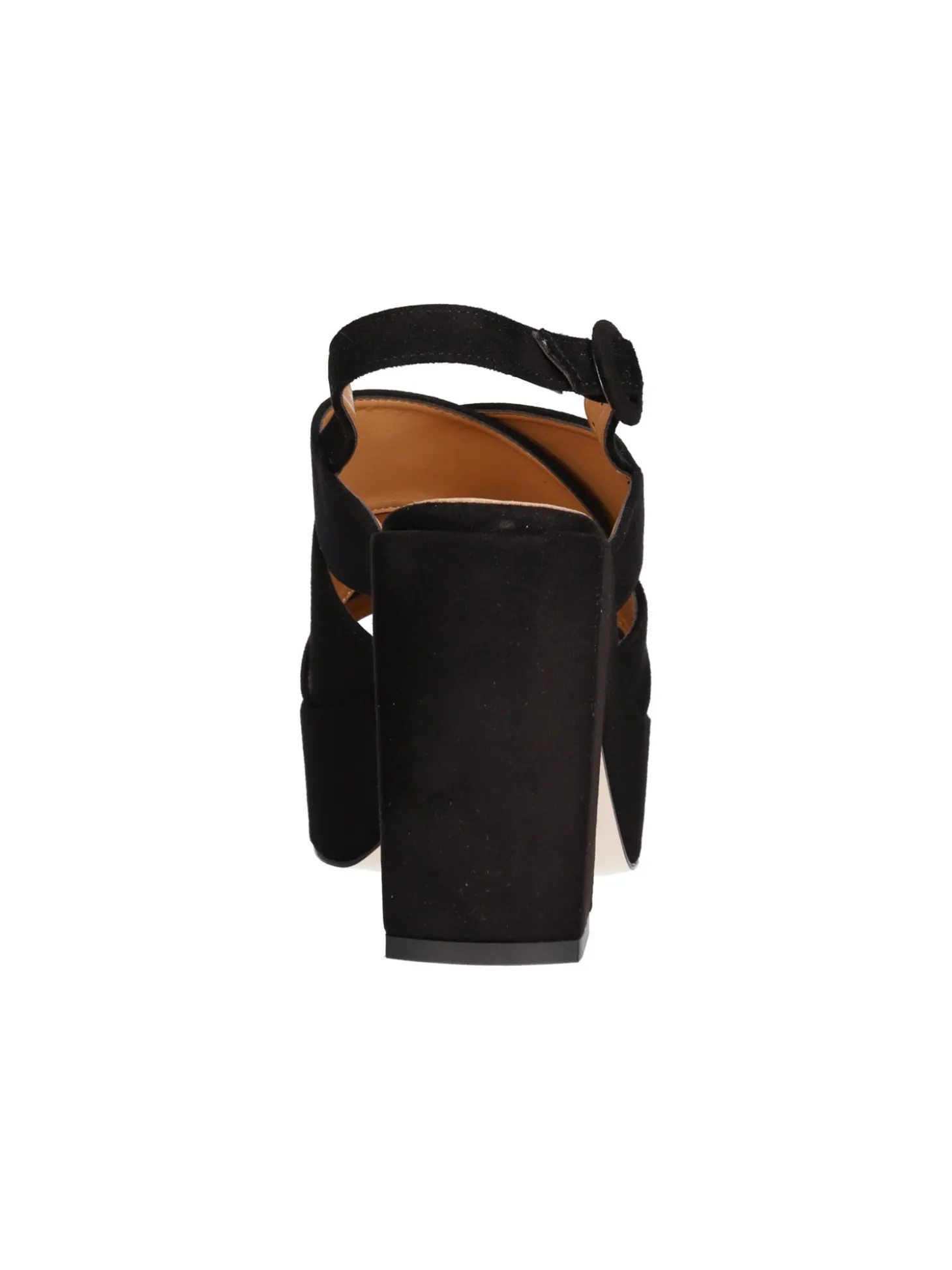 Sandalo Liviana da donna in similcamoscio nero con punta quadrata e cinturino regolabile. Sottopiede in vera pelle, fondo in gomma e tacco di 10cm con plateau di 3,5cm.