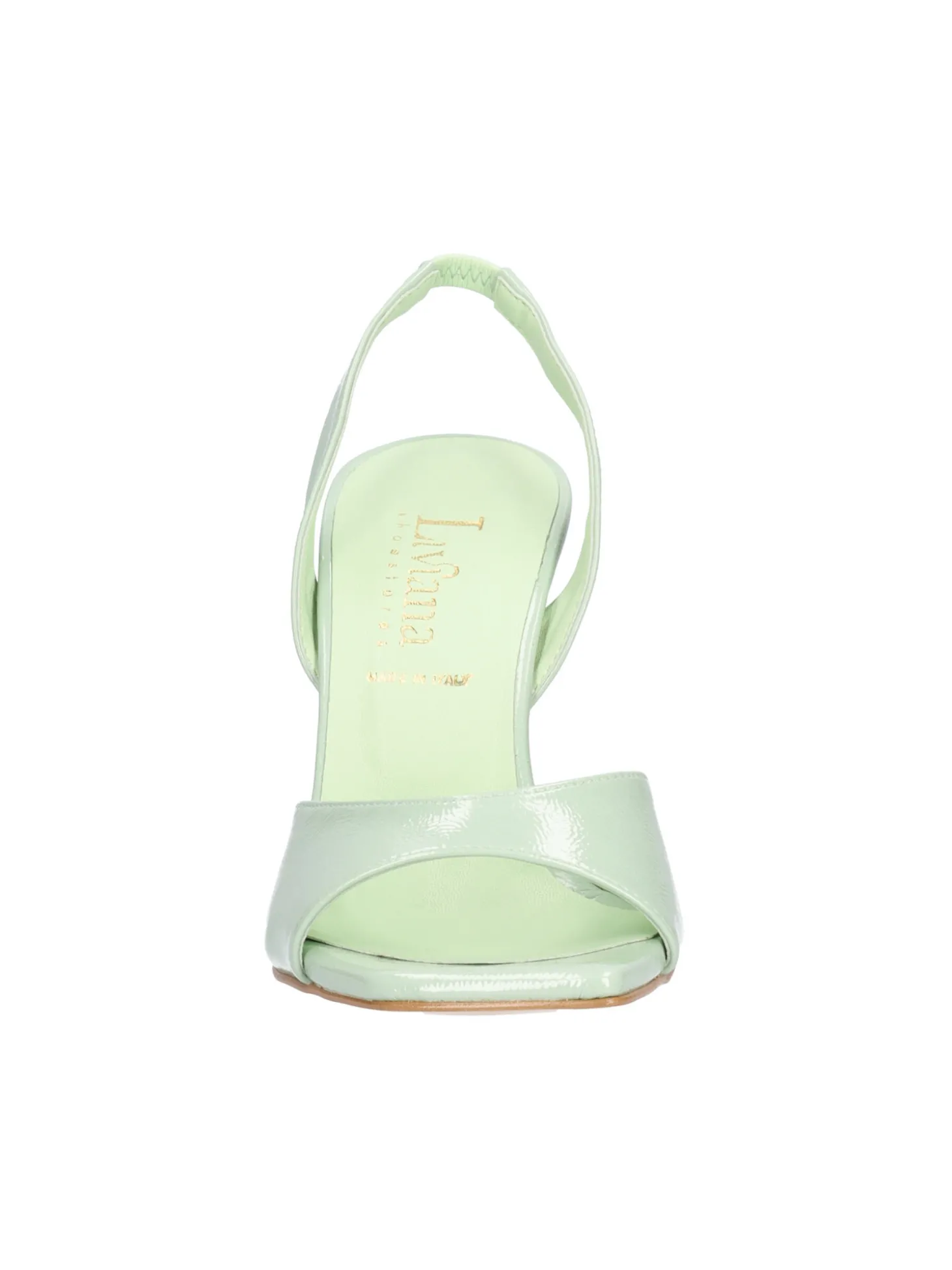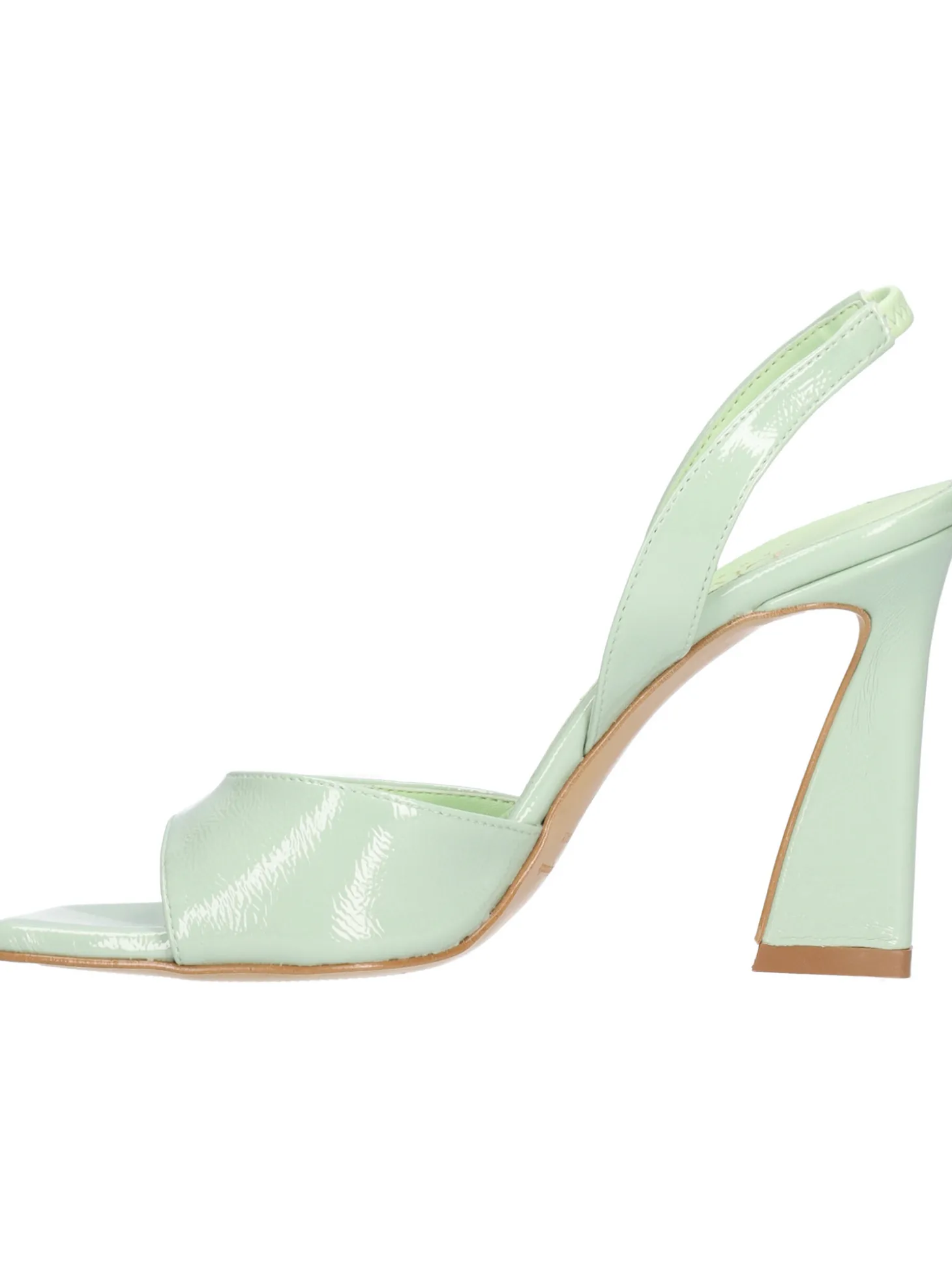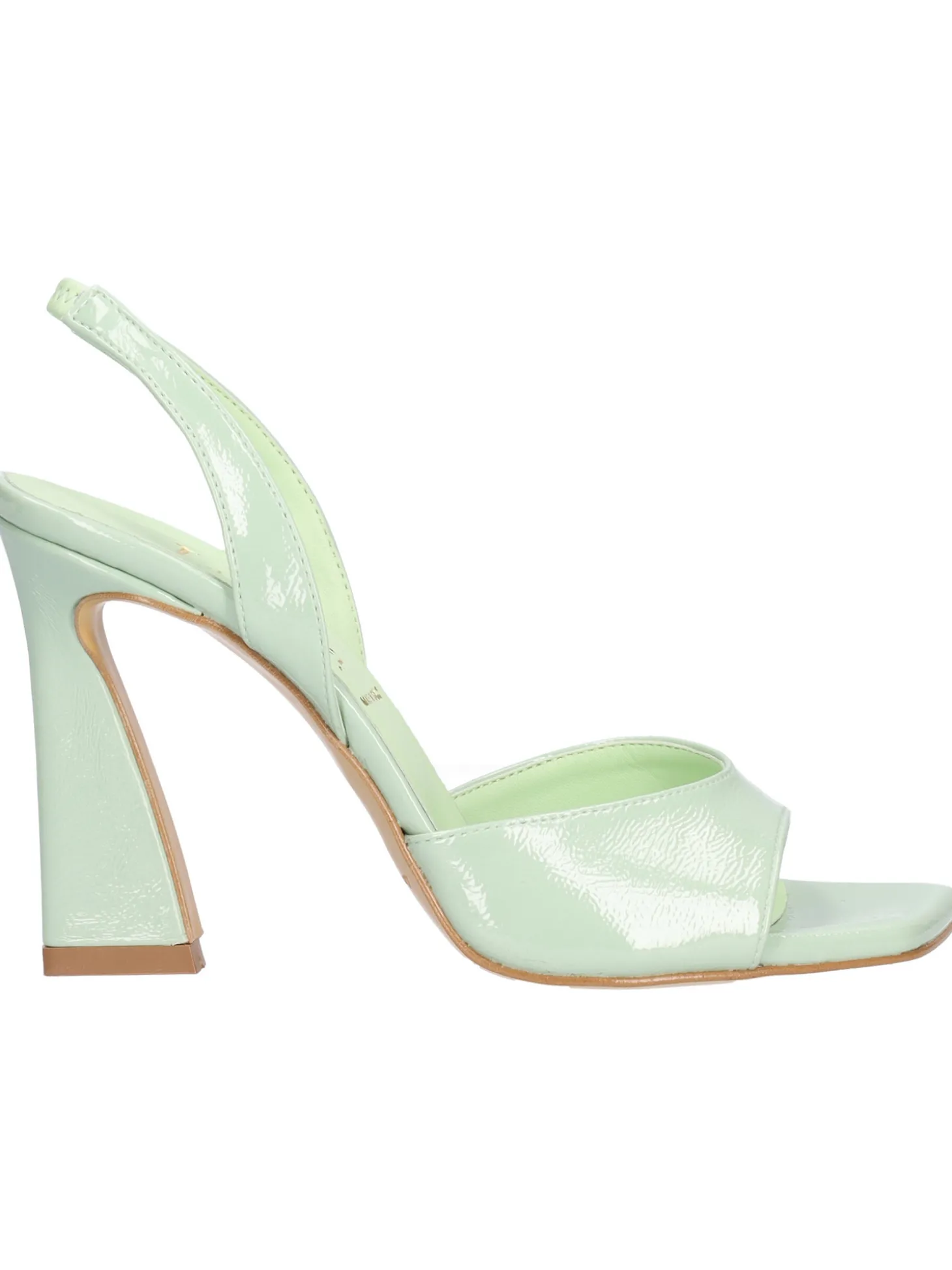 Sandalo tacco largo Liviana da donna in vernice verde effetto stroppicciato con punta quadrata e cinturino elastico. Sottopiede in pelle, fondo in gomma e tacco di 10cm.