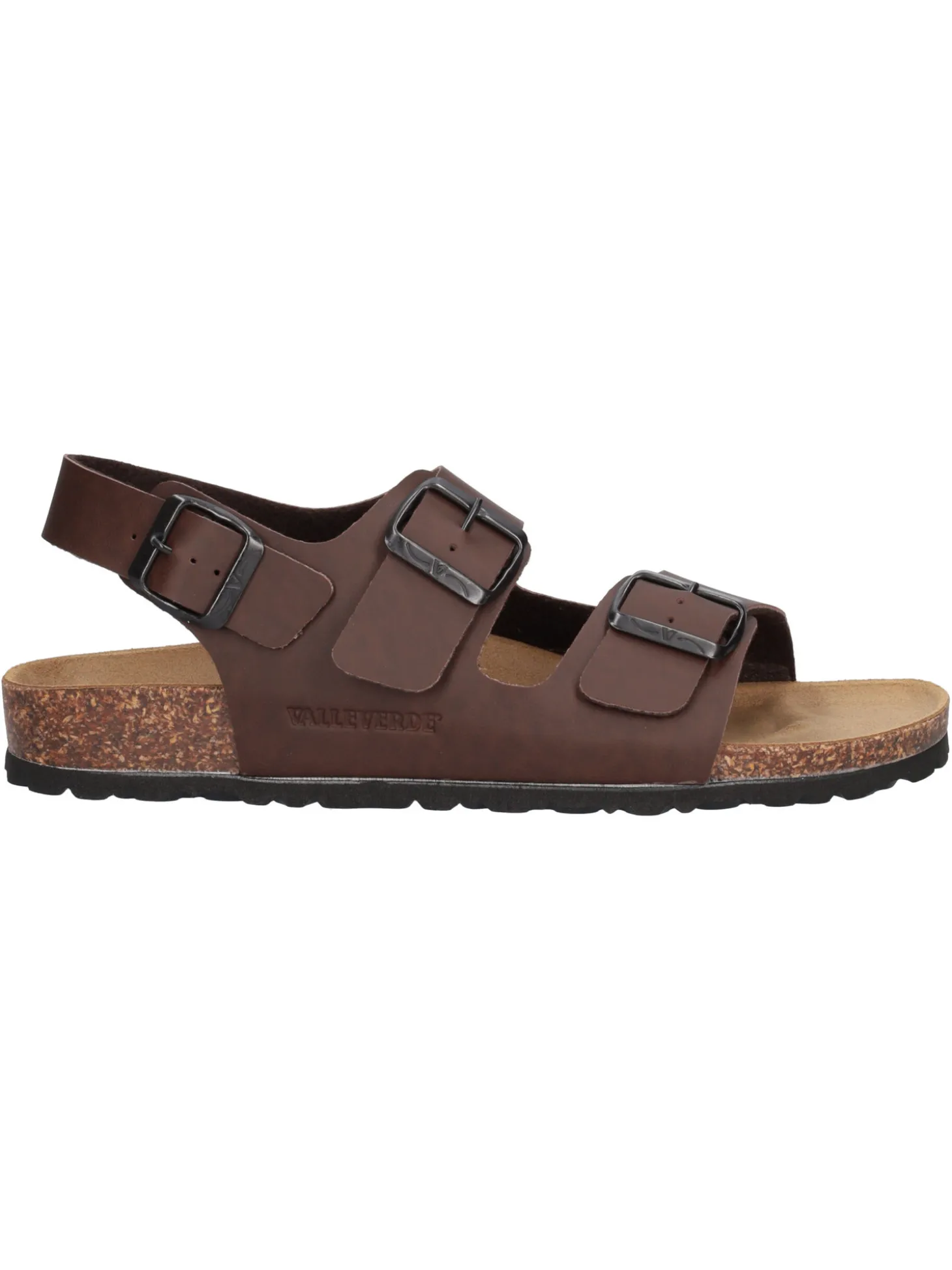 Sandalo Valleverde da uomo in ecopelle marrone con fasce regolabili, sottopiede in vera pelle scamosciata e fodera in tessuto fondo in gomma.