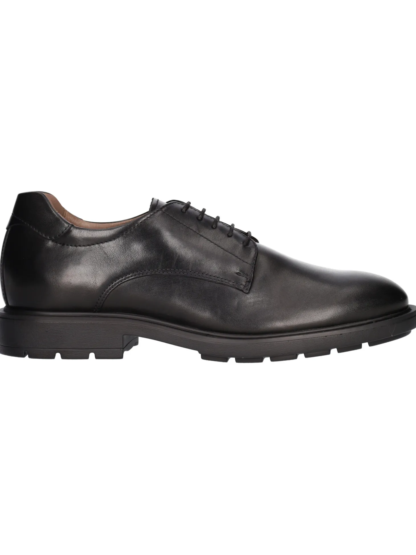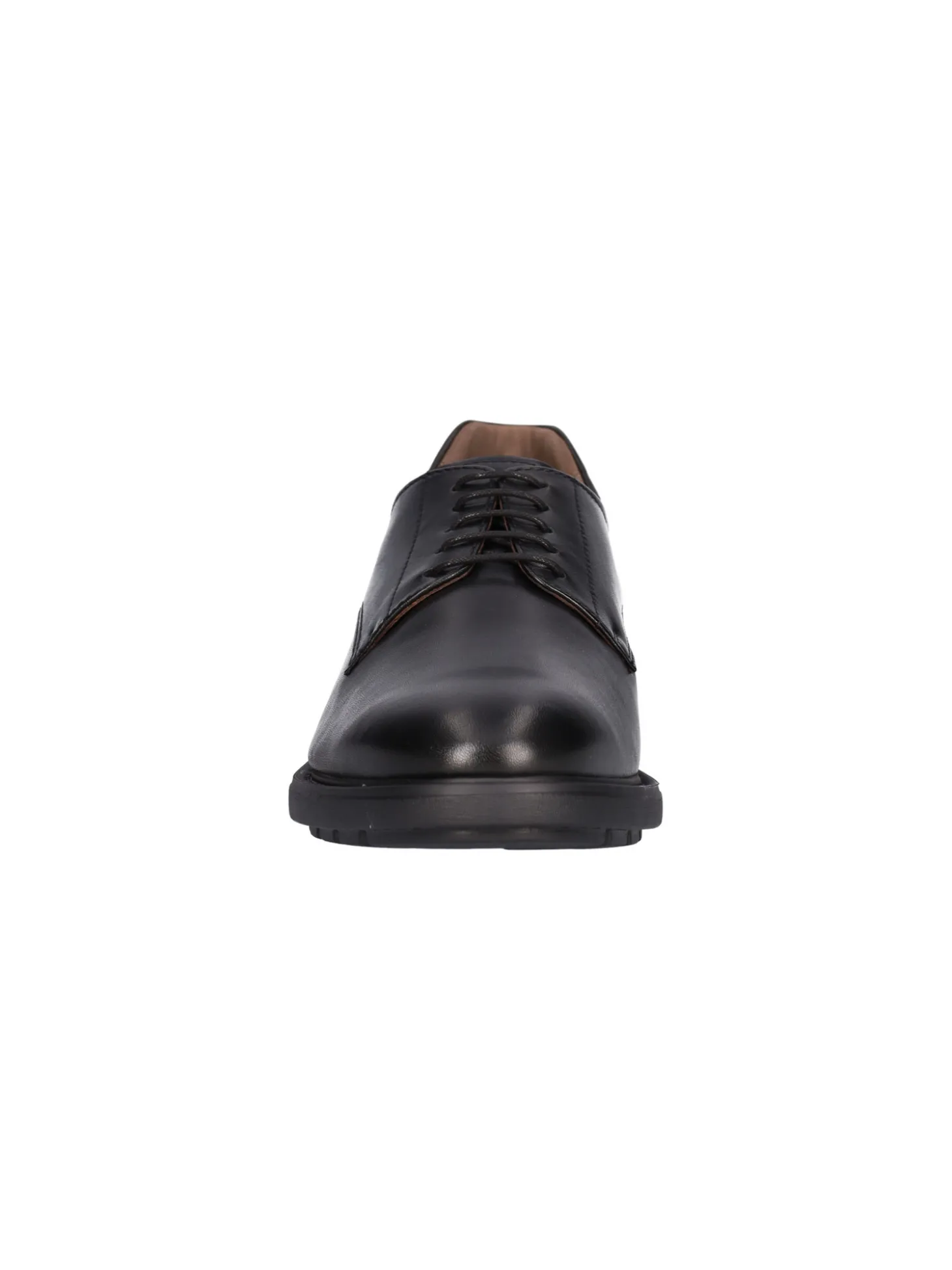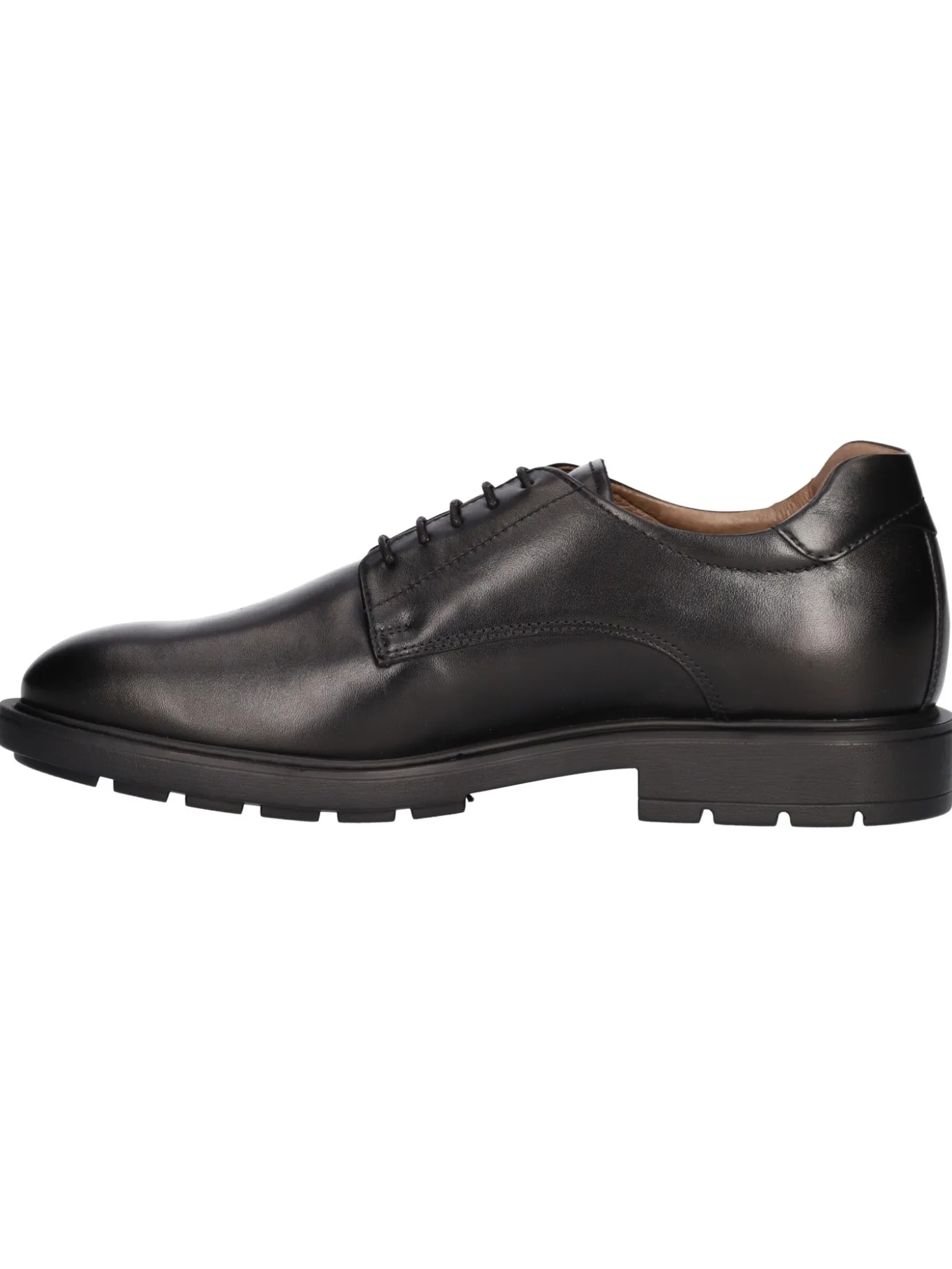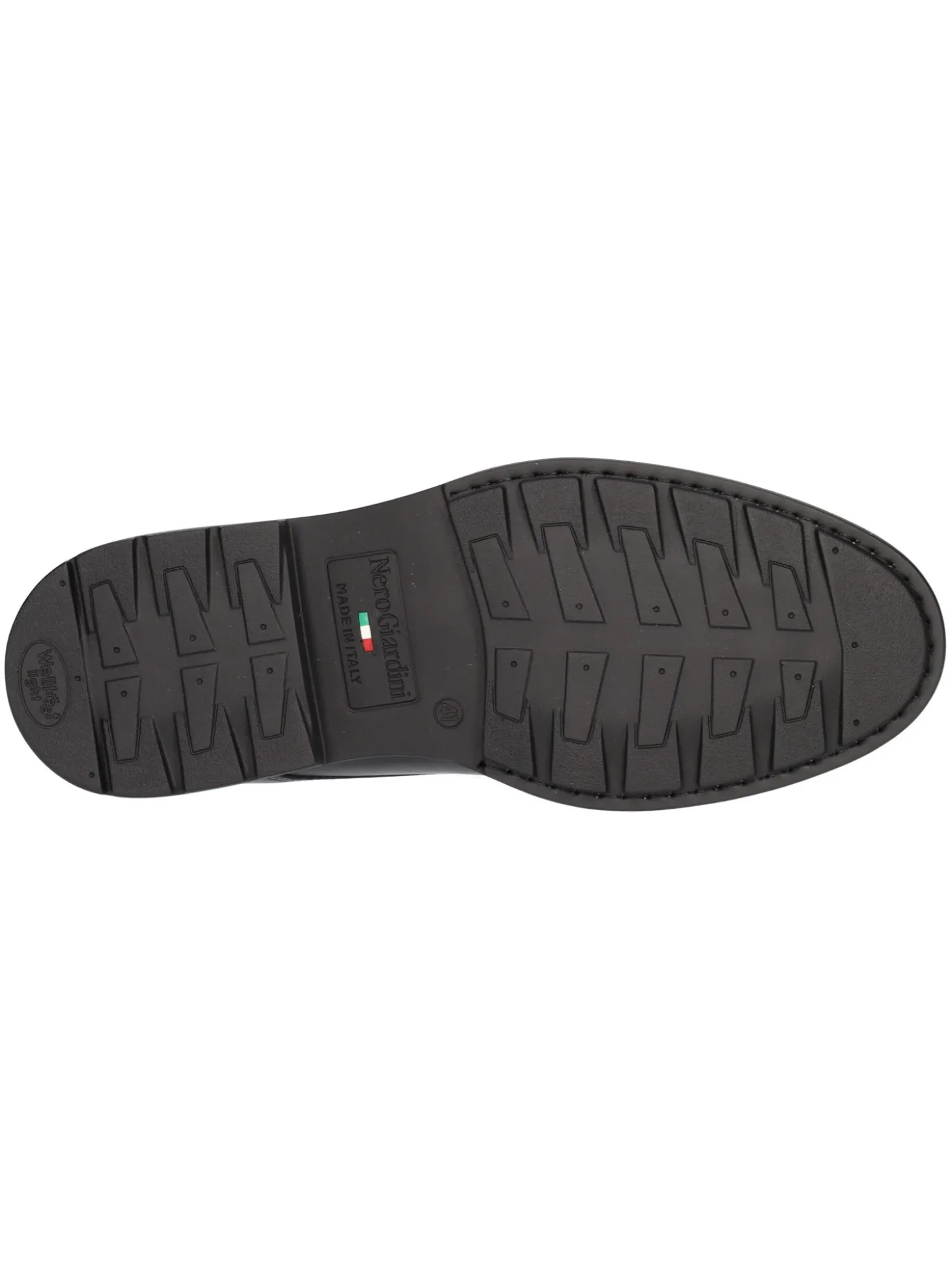 Scarpa stringata Nero Giardini da uomo in pelle nera con laccio in tinta e colletto imbottito. Scarpa con sottopiede estraibile sempre in pelle e fondo in gomma antiscivolo.
