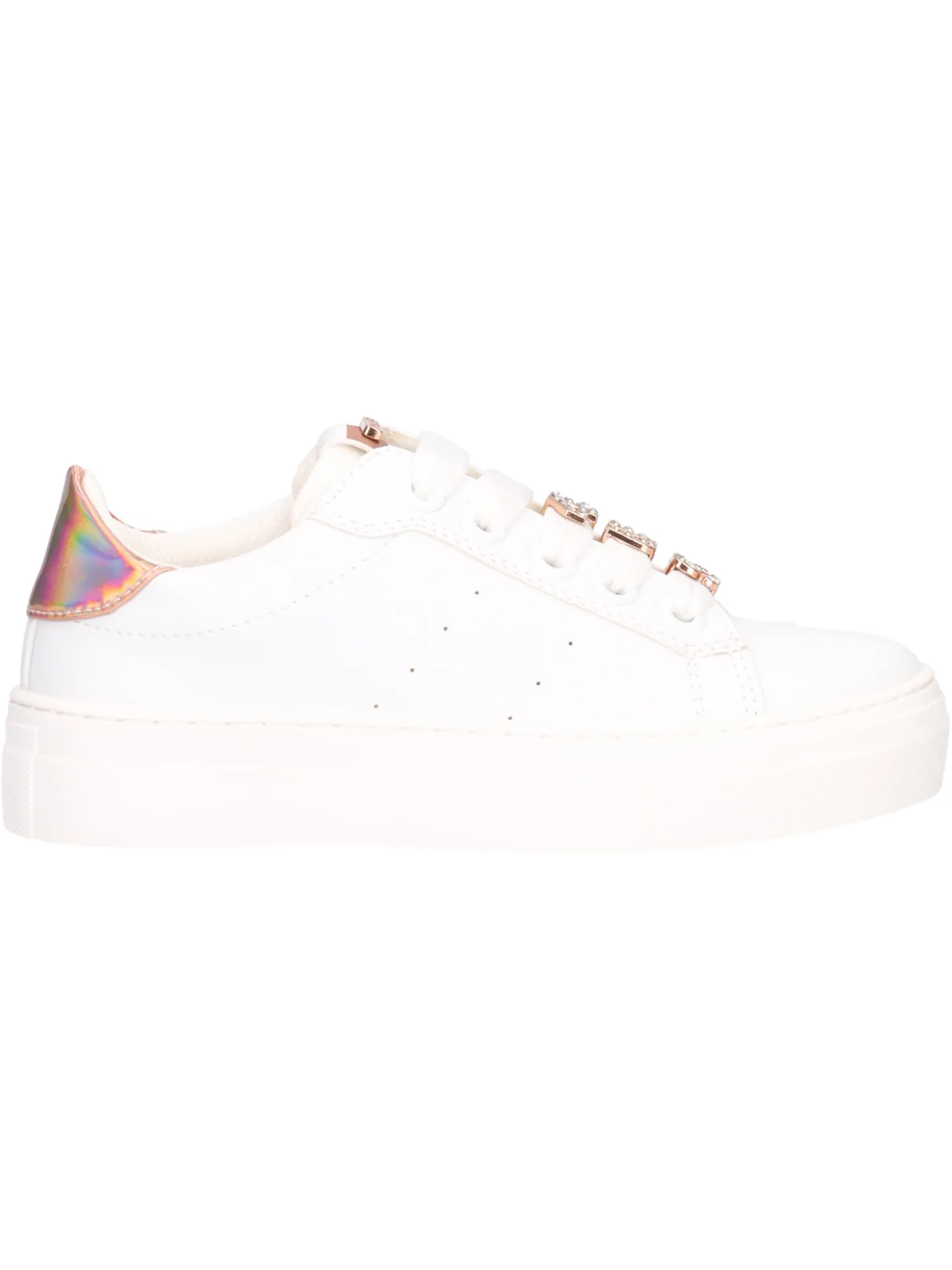 Sneaker 4US da bambina in ecopelle bianca con accessori removibili sul laccio e zip laterale. Fodera in tessuto, sottopiede in vera pelle e fondo in gomma.