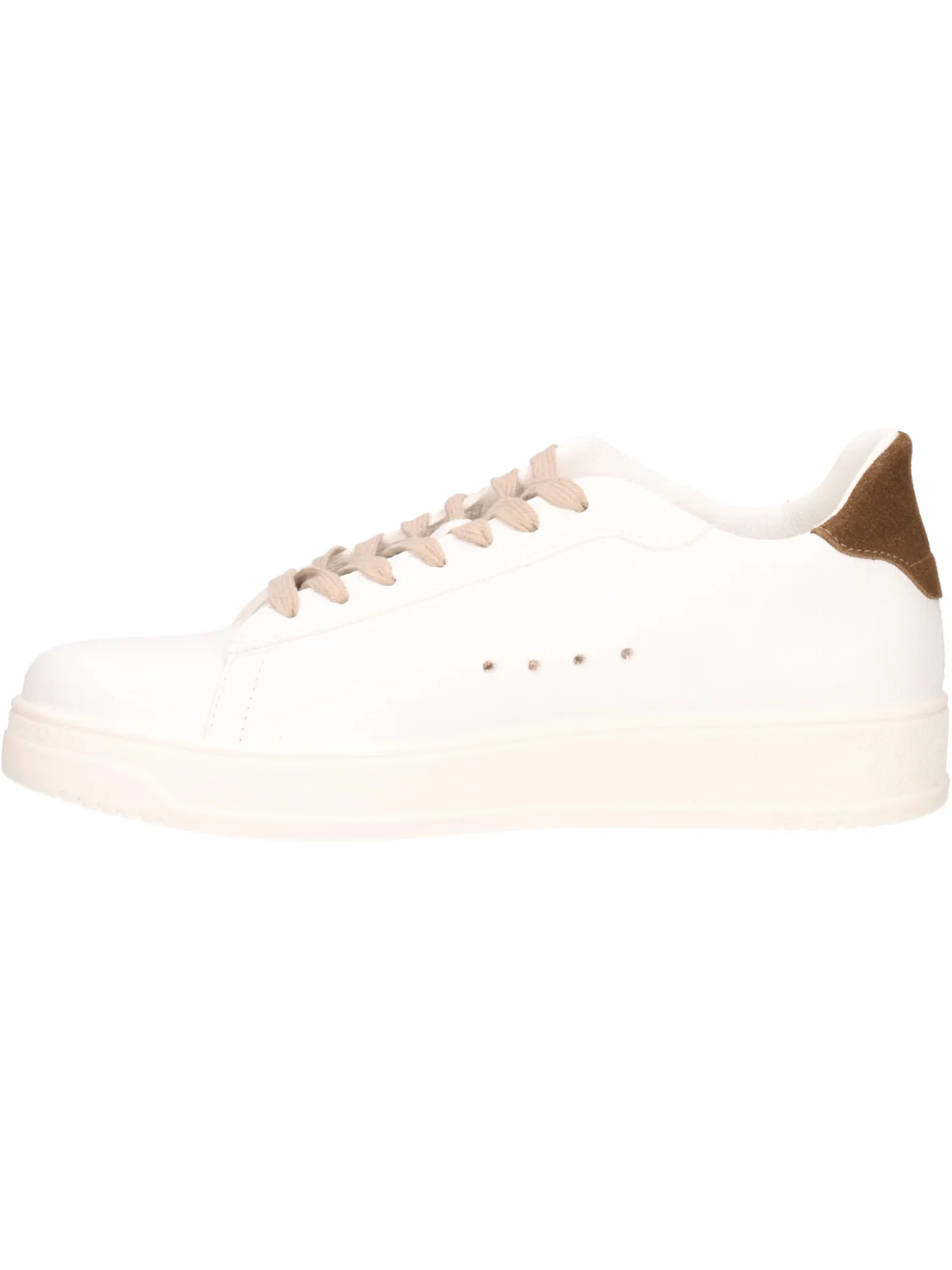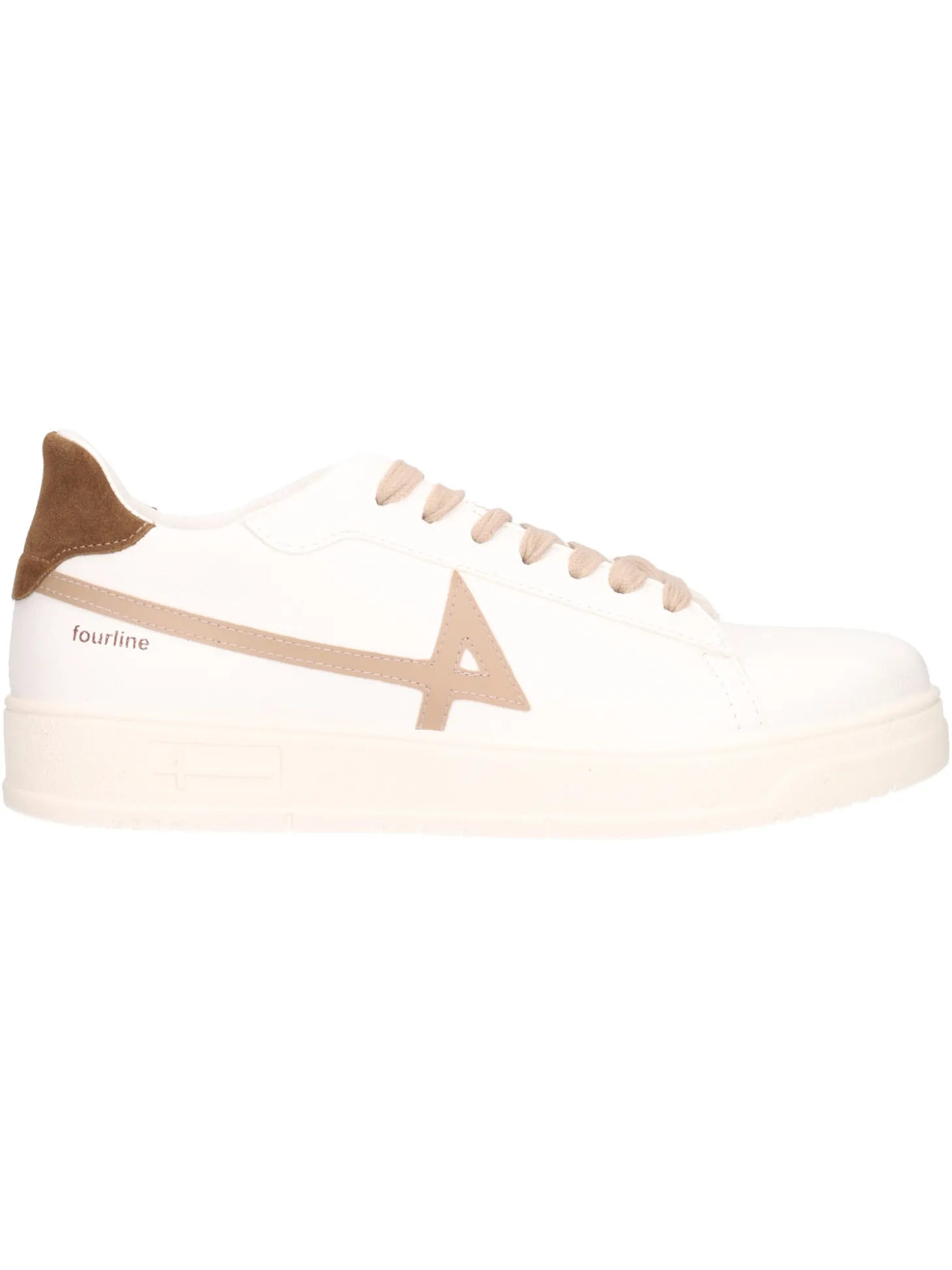 Sneaker Fourline da uomo in morbida ecopelle bianca con dettagli beige e marrone e doppio laccio disponibile ( uno bianco ed uno beige ). Fodera in tessuto, sottopiede estraibile in pelle e fondo in gomma.