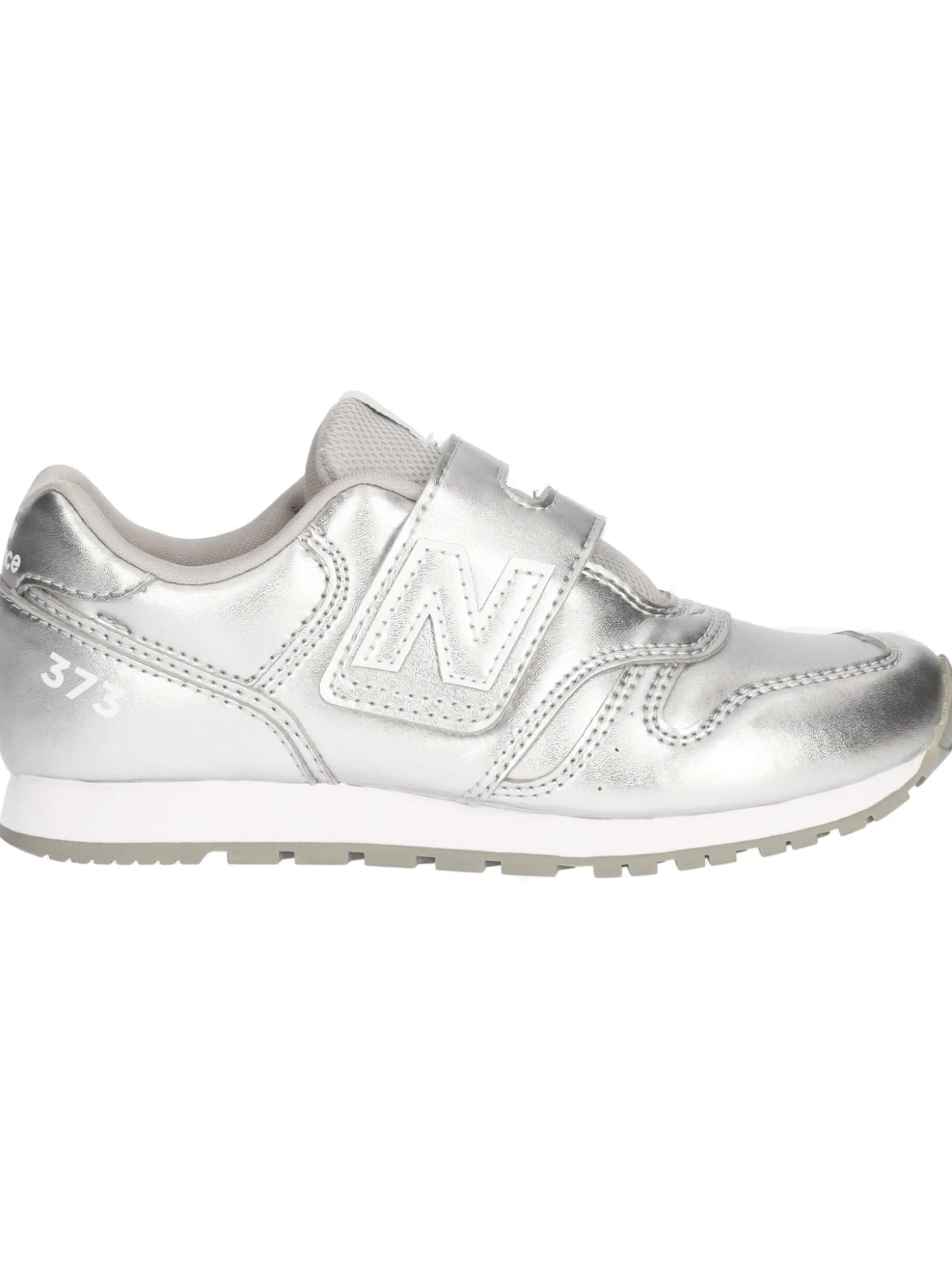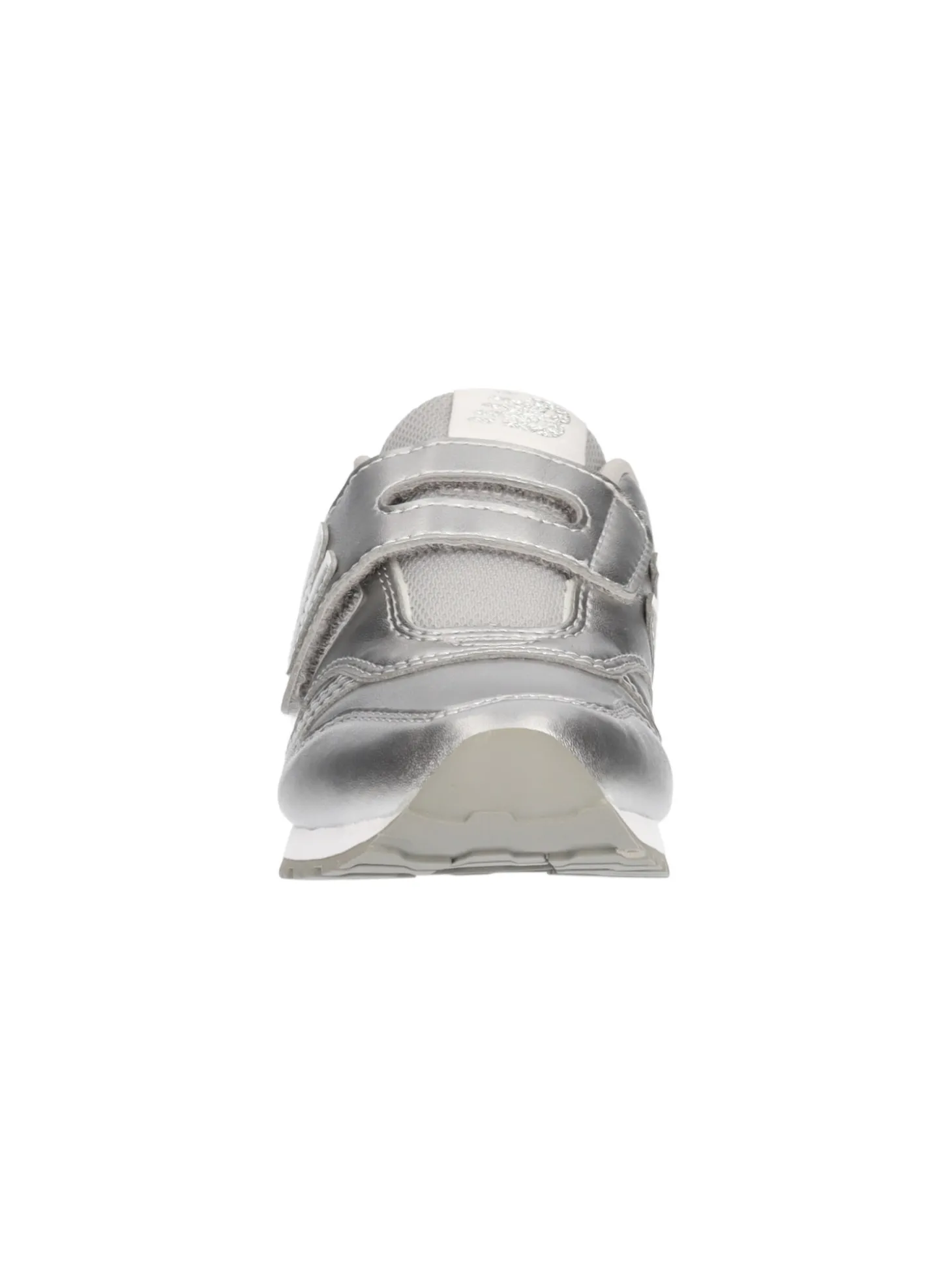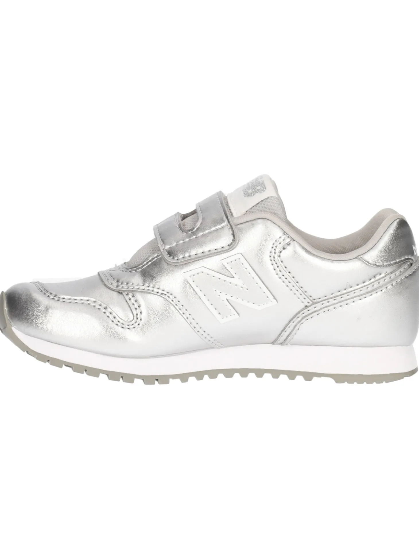 Sneaker New Balance 500 da bambina in ecopelle laminata argento con inserti in tessuto e colletto imbottito. Scarpa con unico stretch regolabile, sottopiede in tessuto e fondo in gomma antiscivolo.