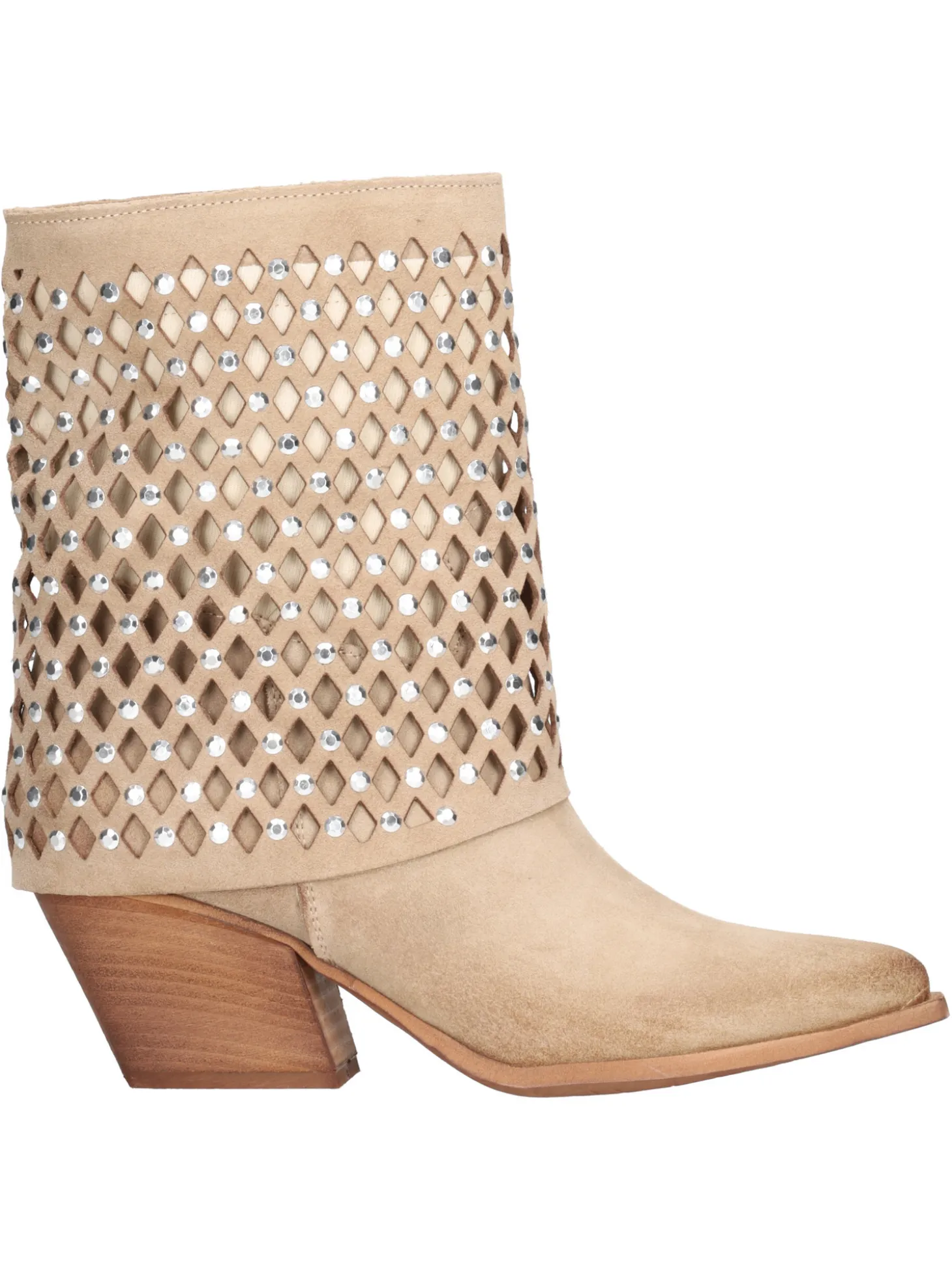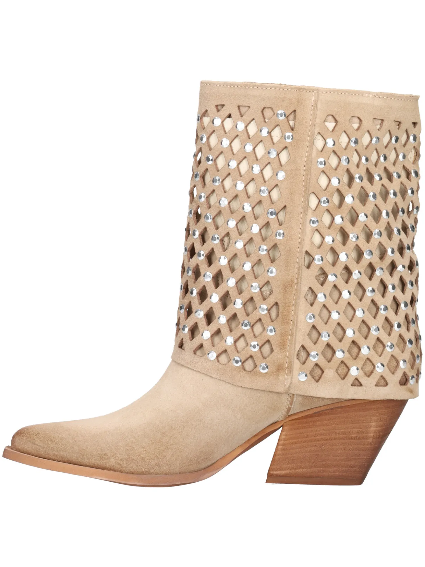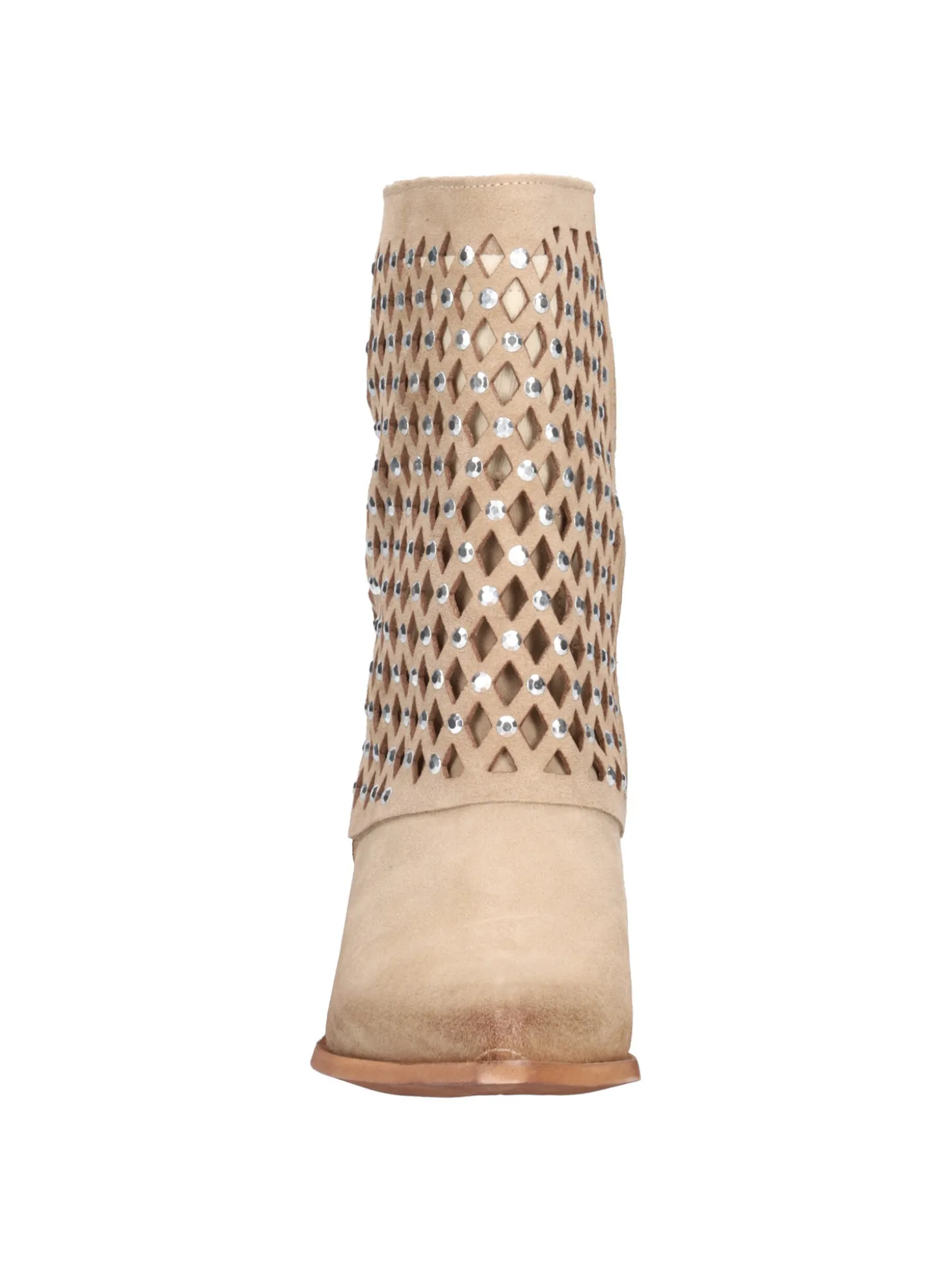 Stivaletto con tacco largo Liviana da donna in crosta beige con borchie, fodera e sottopiede in pelle ed ecopelle fondo in gomma effetto legno e tacco di 7cm.